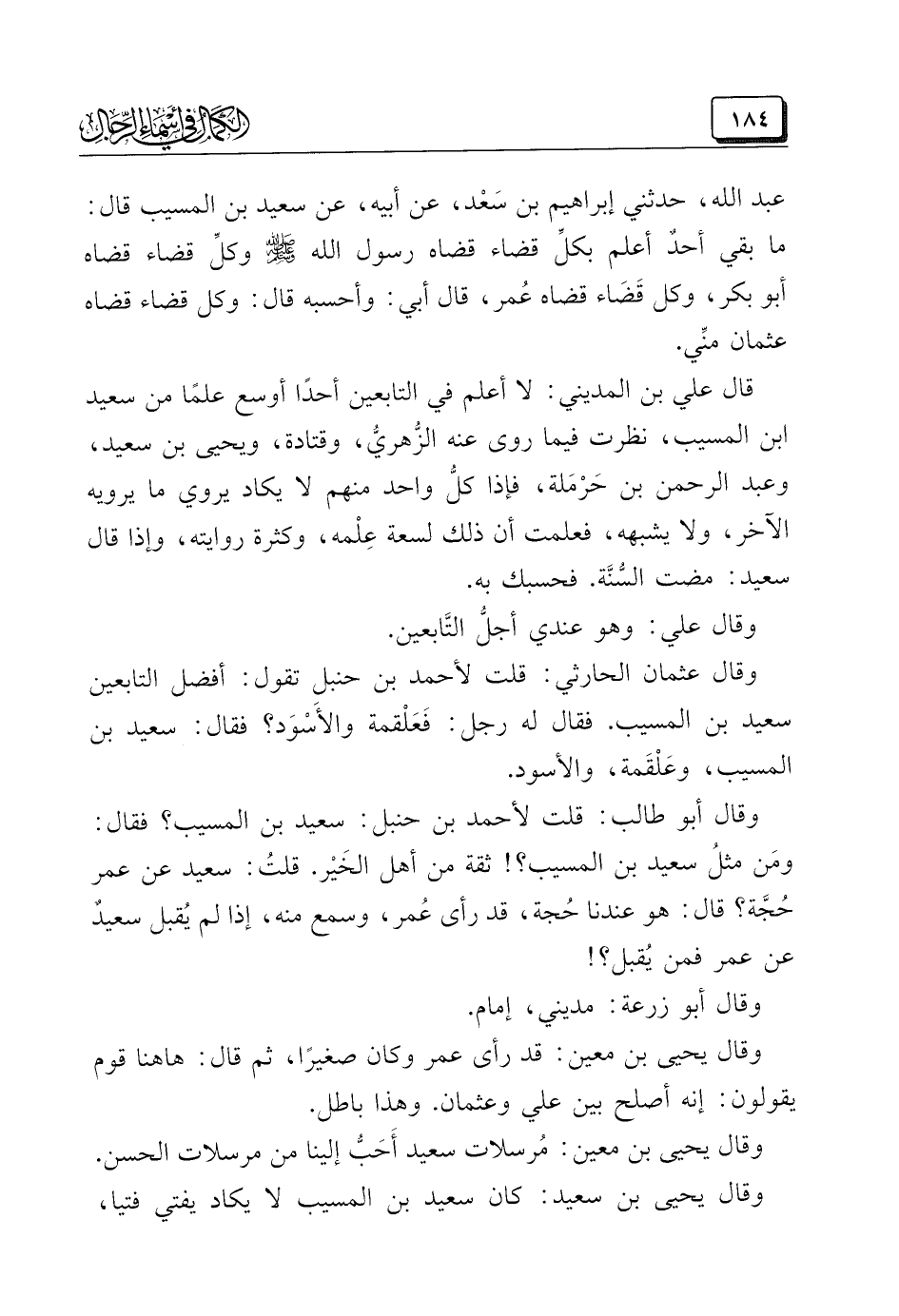 عبد الله، حدَّثني إبراهيم بن سَعْد، عن أبيه، عن سعيد بن المسيّب قال: ما بقي أحدٌ أعلم بكلِّ قضاء قضاه رسول الله -صَلَّى اللهُ عَلَيْهِ وَسَلَّمَ- وكلِّ قضاء قضاه أبو بكر، وكل قَضَاء قضاه عُمر، قال أبي: وأحسبه قال: وكل قضاء قضاه عثمان منِّي.