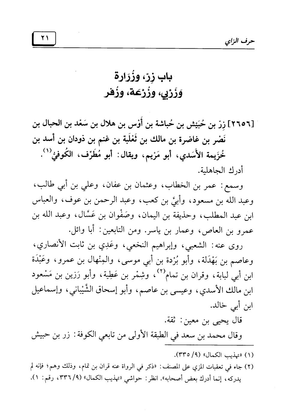 [٢٦٥٦] زِرّ بن حُبَيْش بن حُباشة بن أَوْس بن هلال بن سَعْد بن الحبال بن نَصْر بن غاضرة بن مالك بن ثَعْلَبة بن غنم بن ذودان بن أسد بن خُزَيمة الأَسَدي، أبو مَرْيم، ويقال: أبو مُطَرِّف، الكُوفيُّ (¬١).