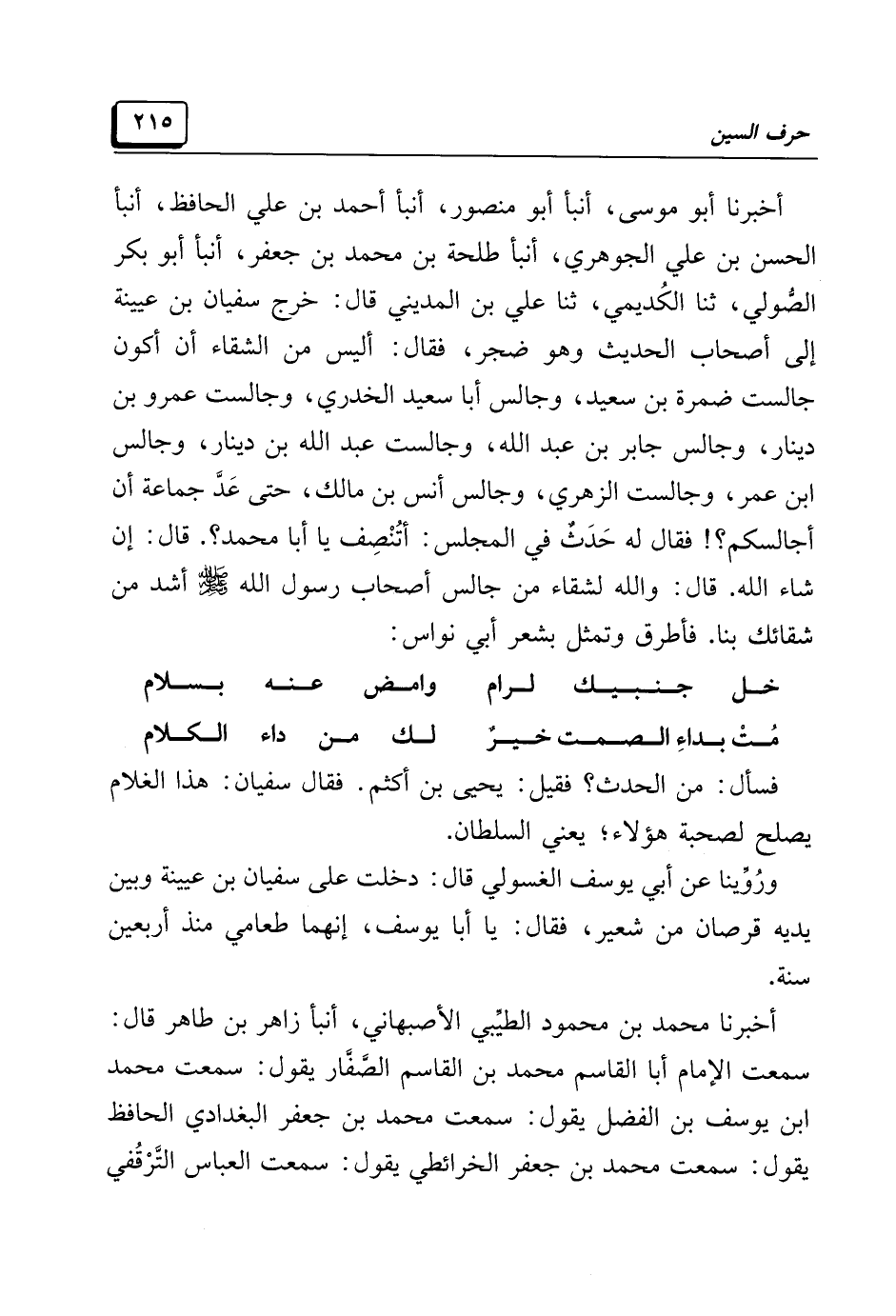أخبرنا أبو موسى، أنبأ أبو منصور، أنبأ أحمد بن عليّ الحافظ، أنبأ الحسن بن عليّ الجَوْهَرِيّ، أنبأ طَلْحة بن محمد بن جعفر، أنبأ أبو بكر الصُّولي، ثنا الكُدَيْمي، ثنا عليّ بن المَدِيني قال: خرج سُفْيَان بن عُيَيْنَة إلى أصحاب الحديث وهو ضجر، فقال: أليس من الشقاء أن أكون جالست ضَمْرَة بن سَعِيد، وجالس أبا سَعِيد الخُدْرِيّ، وجالست عَمْرو بن دينار، وجالس جابر بن عبد الله، وجالست عبد الله بن دينار، وجالس ابن عمر، وجالست الزُّهْرِيّ، وجالس أنس بن مالك، حتَّى عَدَّ جماعة أن أجالسكم؟ ! فقال له حَدَثٌ في المجلس: أتُنْصِف يا أبا محمد؟ . قال: إن شاء الله. قال: والله لشقاء من جالس أصحاب رسول الله -صَلَّى اللهُ عَلَيْهِ وَسَلَّمَ- أشد من شقائك بنا. فأطرق وتمثل بشعر أبي نواس: