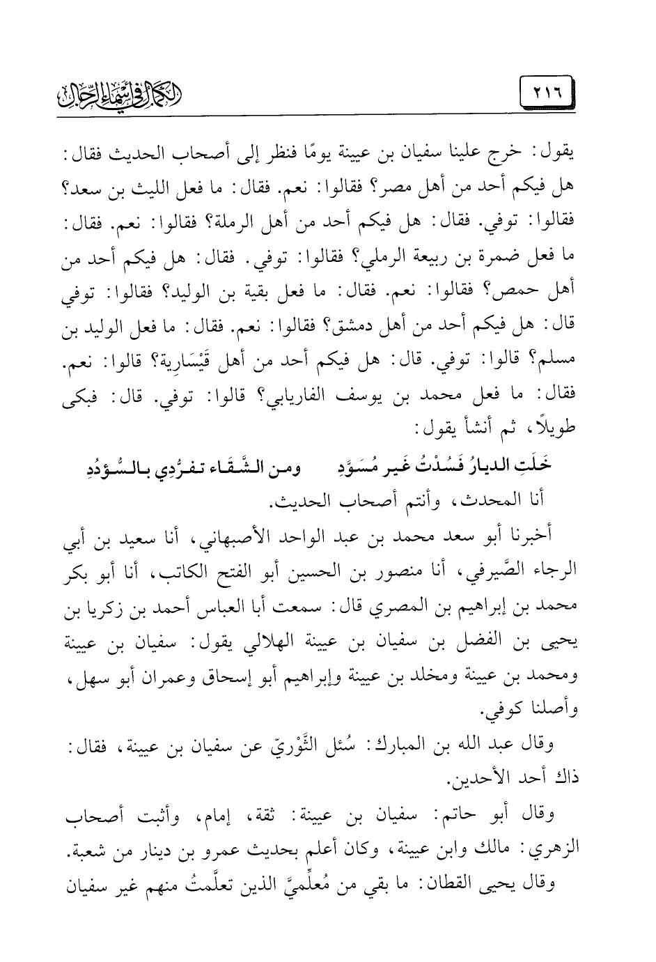 يقول: خرج علينا سُفْيَان بن عُيَيْنَة يومًا فنظر إلى أصحاب الحديث فقال: هل فيكم أحد من أهل مصر؟ فقالوا: نعم. فقال: ما فعل اللَّيْث بن سعد؟ فقالوا: توفي. فقال: هل فيكم أحد من أهل الرملة؟ فقالوا: نعم. فقال: ما فعل ضَمْرَة بن رَبِيعَة الرملي؟ فقالوا: توفي. فقال: هل فيكم أحد من أهل حمص؟ فقالوا: نعم. فقال: ما فعل بقيَّة بن الوليد؟ فقالوا: توفي قال: هل فيكم أحد من أهل دمشق؟ فقالوا: نعم. فقال: ما فعل الوليد بن مسلم؟ قالوا: توفي. قال: هل فيكم أحد من أهل قَيْسَارِية؟ قالوا: نعم. فقال: ما فعل محمد بن يوسف الفاريابي؟ قالوا: توفي. قال: فبكي طويلًا، ثمَّ أنشأ يقول: