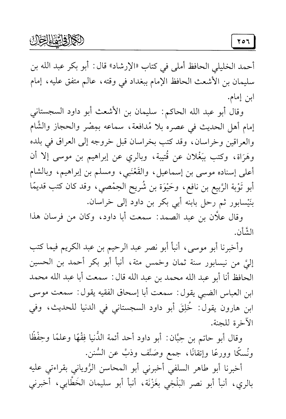 أحمد الخليلي الحافظ أملى في كتاب "الإرشاد" قال: أبو بكر عبد الله بن سليمان بن الأشعث الحافظ الإمام ببغداد في وقته، عالم متفق عليه، إمام ابن إمام.