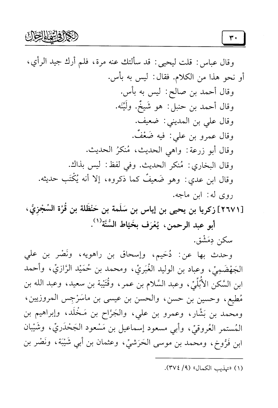 [٢٦٧١] زكريا بن يحيى بن إياس بن سَلَمة بن حَنْظَلة بن قُرَّة السِّجْزِيُّ، أبو عبد الرحمن، يُعْرَف بخَيَّاط السُّنَّة (¬١).