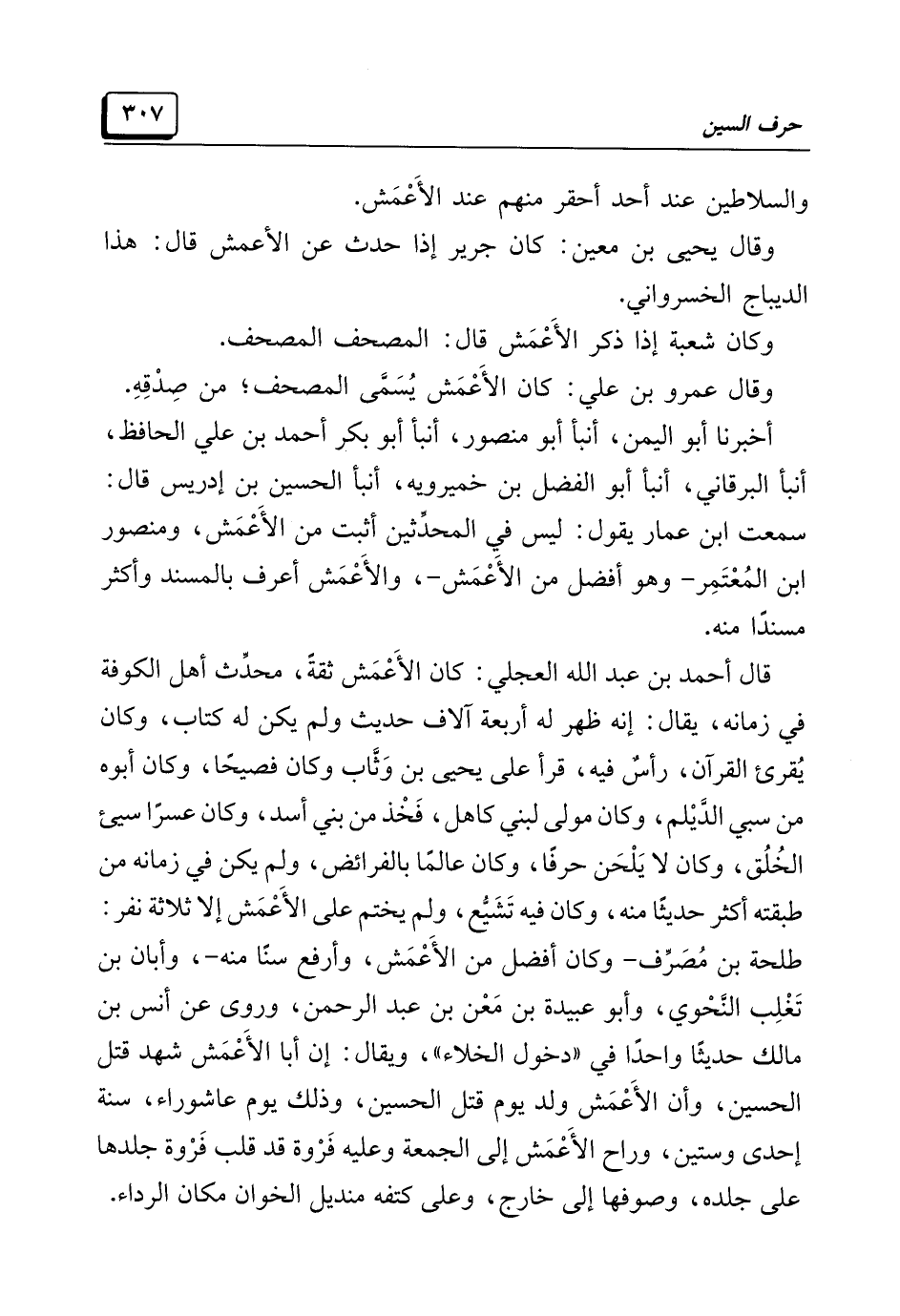 قال أحمد بن عبد الله العجلي: كان الأَعْمَش ثقةً، محدِّث أهل الكوفة في زمانه، يقال: إنه ظهر له أربعة آلاف حديث ولم يكن له كتاب، وكان يُقرئ القرآن، رأسٌ فيه، قرأ على يحيى بن وَثَّاب وكان فصيحًا، وكان أبوه من سبي الدَّيْلم، وكان مولي لبني كاهل، فَخْذ من بني أسد، وكان عسرًا سيئ الخُلُق، وكان لا يَلْحَن حرفًا، وكان عالمًا بالفرائض، ولم يكن في زمانه من طبقته أكثر حديثًا منه، وكان فيه تَشَيُّع، ولم يختم على الأَعْمَش إلا ثلاثة نفر: طلحة بن مُصَرِّف -وكان أفضل من الأَعْمَش، وأرفع سنًّا منه-، وأبان بن تَغْلِب النَّحْوي، وأبو عُبَيْدة بن مَعْن بن عبد الرحمن، وروى عن أنس بن مالك حديثًا واحدًا في "دخول الخلاء"، ويقال: إن أبا الأَعْمَش شهد قتل الحسين، وأن الأَعْمَش ولد يوم قتل الحسين، وذلك يوم عاشوراء، سنة إحدى وستين، وراح الأَعْمَش إلى الجمعة وعليه فَرْوة قد قلب فَرْوة جلدها على جلده، وصوفها إلى خارج، وعلى كتفه منديل الخوان مكان الرداء.