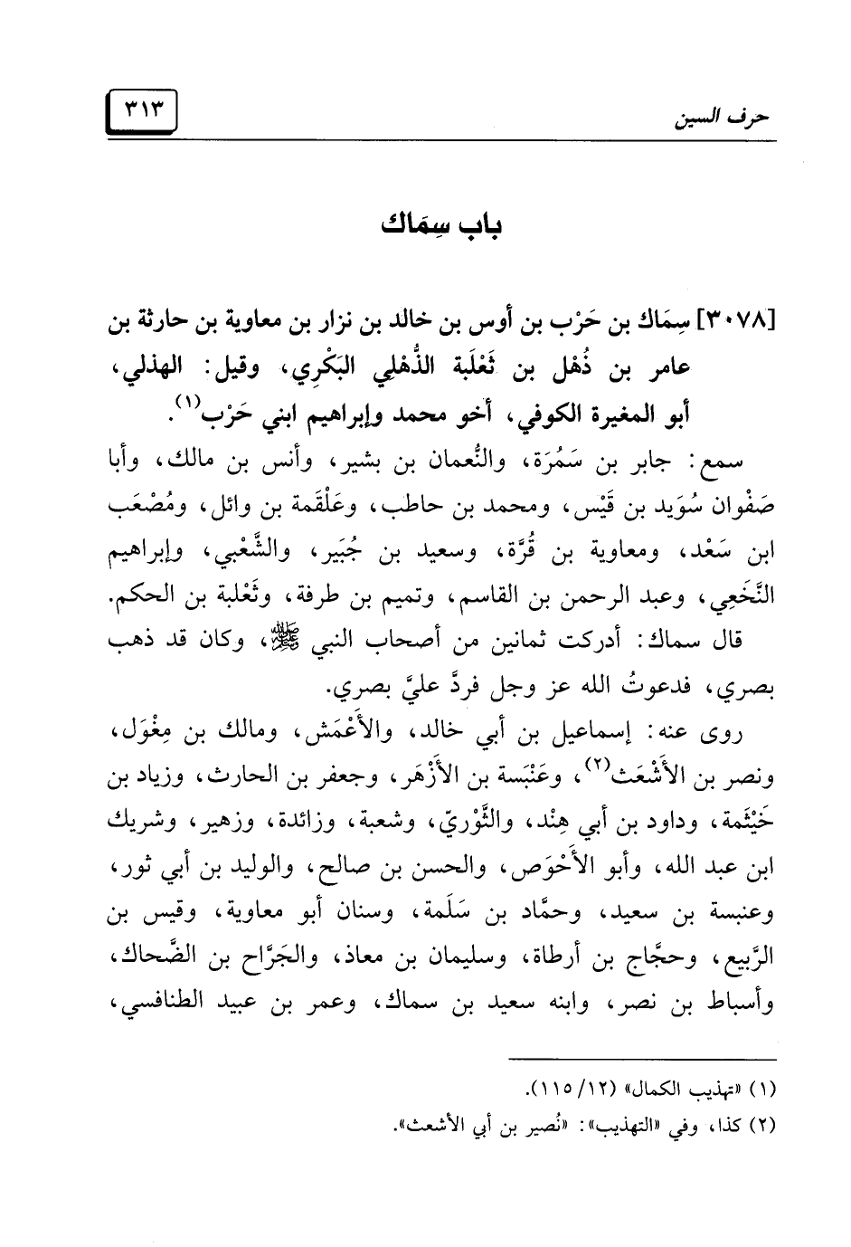 [٣٠٧٨] سِمَاك بن حَرْب بن أوس بن خالد بن نزار بن معاوية بن حارثة بن عامر بن ذُهْل بن ثَعْلَبة الذُّهْلِي البَكْرِي، وقيل: الهذلي، أبو المغيرة الكوفي، أخو محمد وإبراهيم ابني حَرْب (¬١).