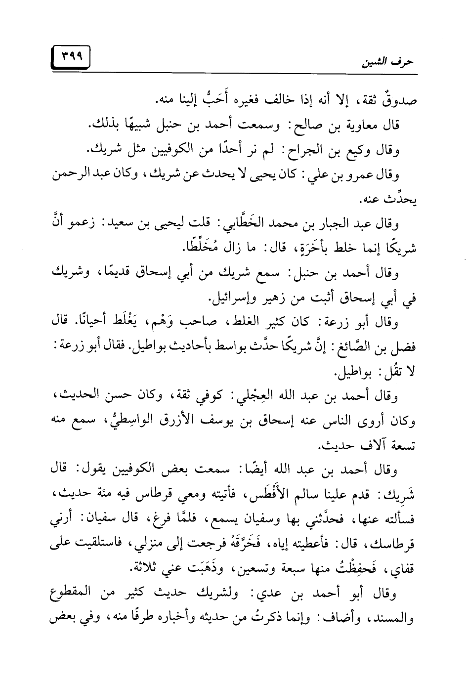 وقال أبو أحمد بن عدي: ولشريك حديث كثير من المقطوع والمسند، وأضاف: وإنما ذكرتُ من حديثه وأخباره طرفًا منه، وفي بعض