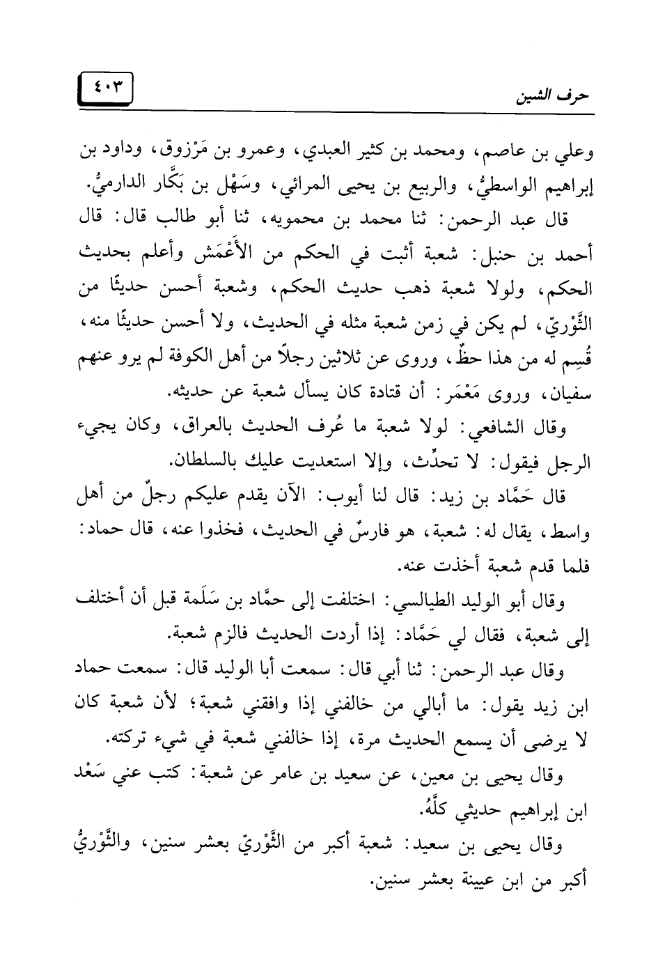 وقال الشافعي: لولا شعبة ما عُرف الحديث بالعراق، وكان يجيء الرجل فيقول: لا تحدِّث، وإلا استعديت عليك بالسلطان.