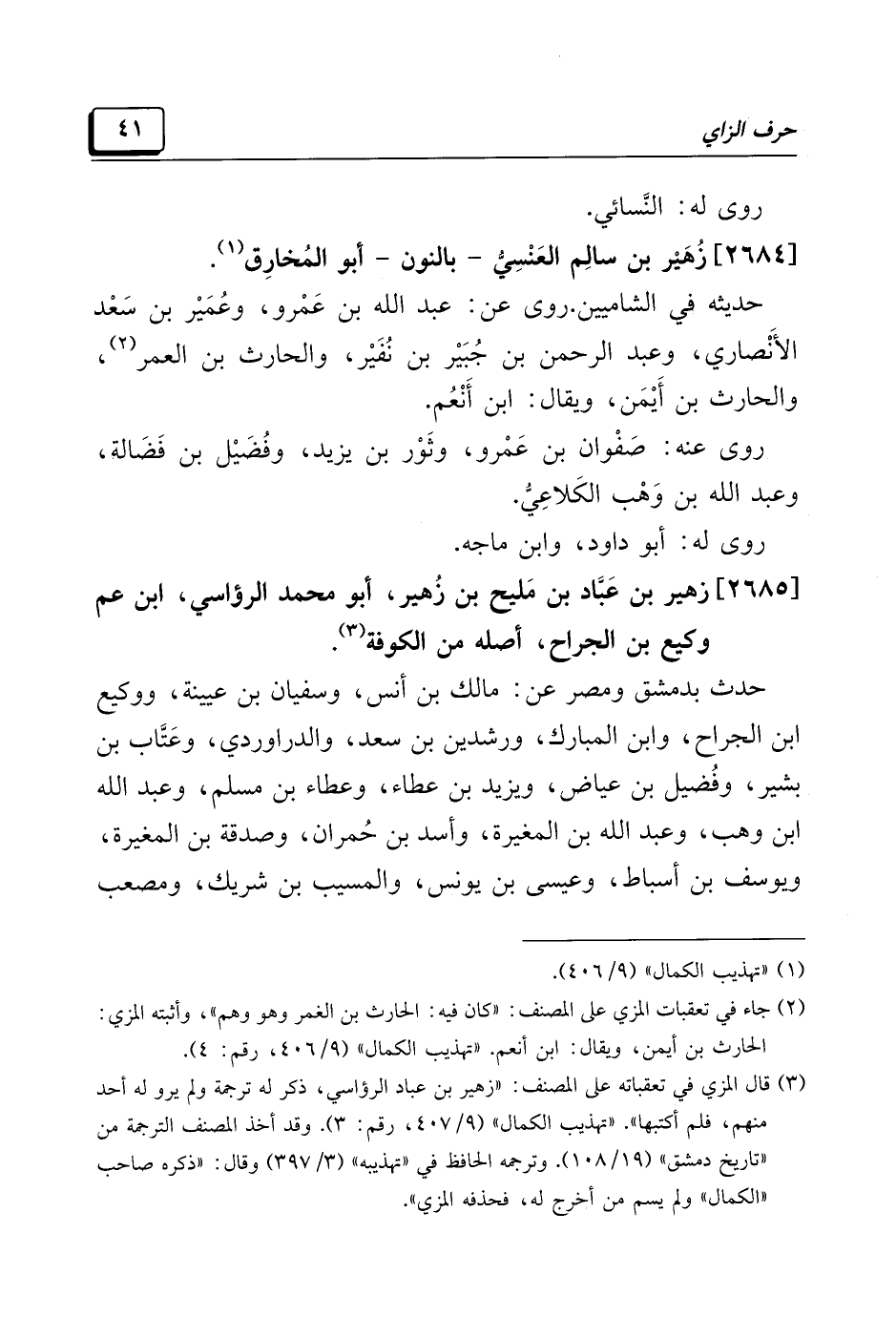(¬٣) قال المزي في تعقباته على المصنف: "زهير بن عباد الرؤاسي، ذكر له ترجمة ولم يرو له أحد منهم، فلم أكتبها". "تهذيب الكمال" (٩/ ٤٠٧، رقم: ٣). وقد أخذ المصنف الترجمة من "تاريخ دمشق" (١٩/ ١٠٨). وترجمه الحافظ في "تهذيبه" (٣/ ٣٩٧) وقال: "ذكره صاحب "الكمال" ولم يسم من أخرج له. فحذفه المزي".
