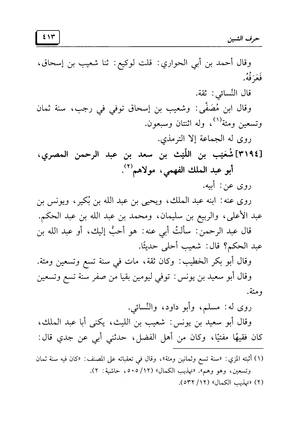 [٣١٩٤] شُعَيْب بن اللَّيْث بن سعد بن عبد الرحمن المصري، أبو عبد الملك الفهمي، مولاهم (¬٢).