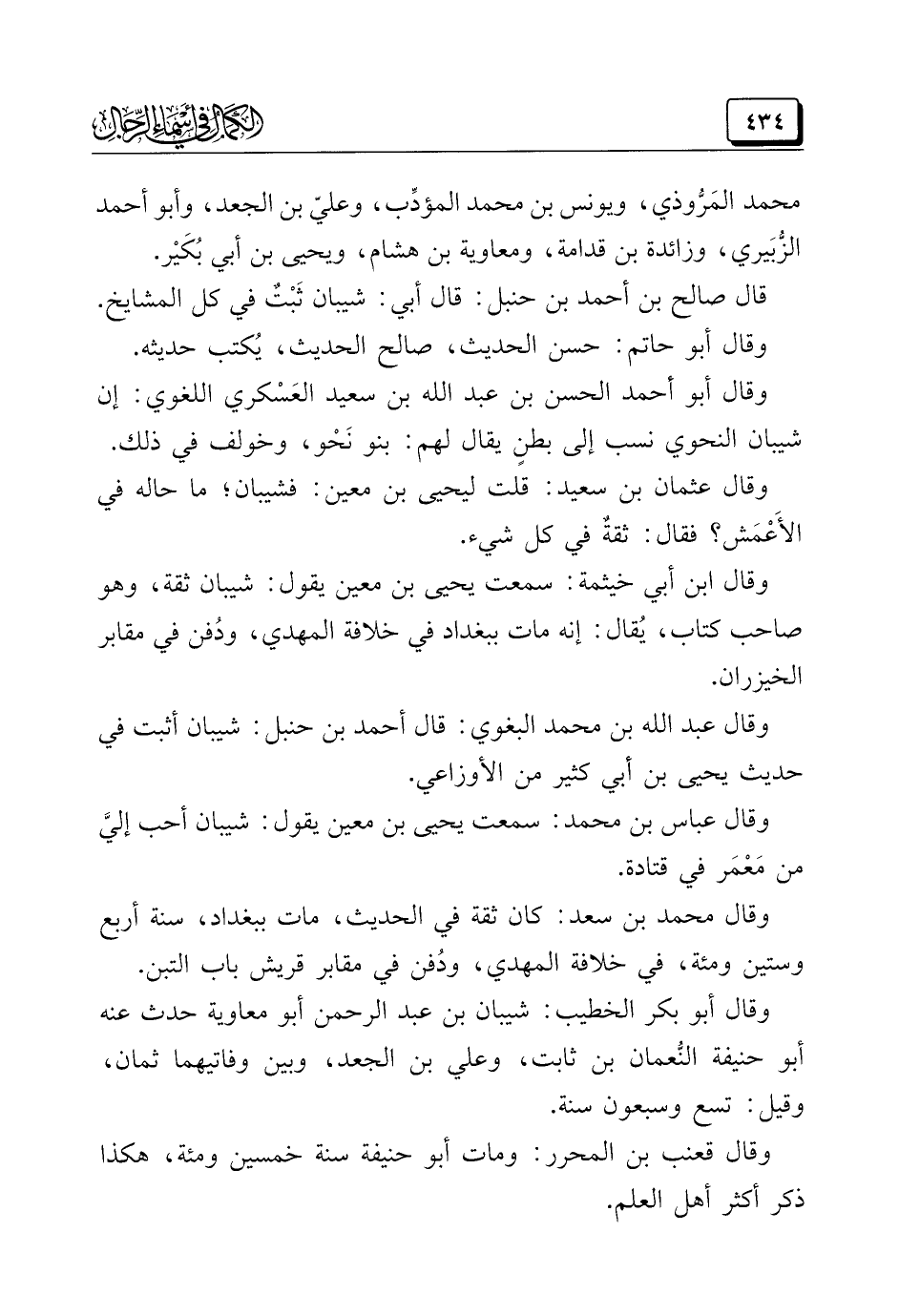 وقال عثمان بن سعيد: قلت ليحيى بن معين: فشيبان؛ ما حاله في الأَعْمَش؟ فقال: ثقةٌ في كل شيء.
