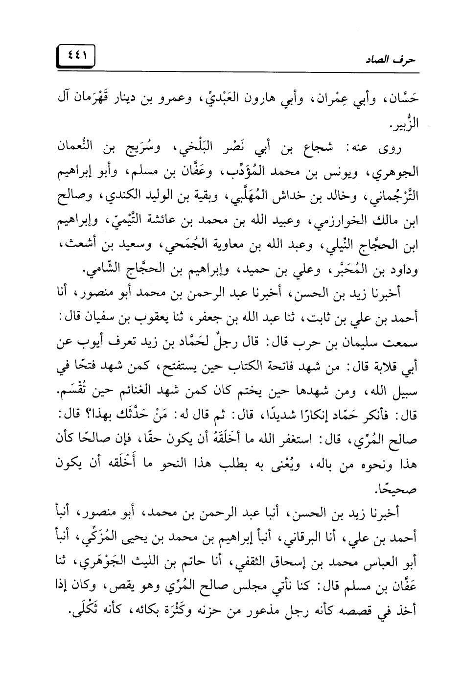 أخبرنا زيد بن الحسن، أخبرنا عبد الرحمن بن محمد أبو منصور، أنا أحمد بن علي بن ثابت، ثنا عبد الله بن جعفر، ثنا يعقوب بن سفيان قال: سمعت سليمان بن حرب قال: قال رجلٌ لحَمَّاد بن زيد تعرف أيوب عن أبي قلابة قال: من شهد فاتحة الكتاب حين يستفتح، كمن شهد فتحًا في سبيل الله، ومن شهدها حين يختم كان كمن شهد الغنائم حين تُقْسَم. قال: فأنكر حَمّاد إنكارًا شديدًا، قال: ثم قال له: مَنْ حَدَّثَك بهذا؟ قال: صالح المُرِّي، قال: استغفر الله ما أخَلَقَهُ أن يكون حقًّا، فإن صالحًا كأن هذا ونحوه من باله، ويُعْني به بطلب هذا النحو ما أَخْلَقه أن يكون صحيحًا.