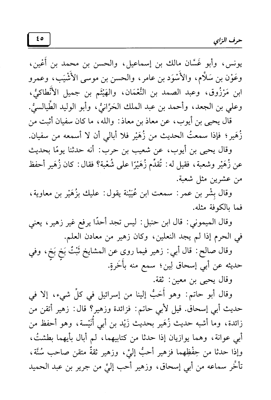 وقال أبو حاتم: وهو أَحَبُّ إلينا من إسرائيل في كلِّ شيء، إلا في حديث أبي إسحاق. قيل لأبي حاتم: فزائدة وزهير؟ قال: زهير أتقن من زائدة، وما أشبه حديث زُهَير بحديث زَيْد بن أبي أُنَيْسة، وهو أحفظ من أبي عوانة، وهما يوازيان إذا حدثا من كتابيهما، لم أبال بأيهما بطشتُ، وإذا حدثا من حِفْظِهما فزهير أحبُّ إليَّ، وزهير ثقةٌ متقن صاحب سُنَّة، تأخَّر سماعه من أبي إسحاق، وزهير أحب إليَّ من جرير بن عبد الحميد