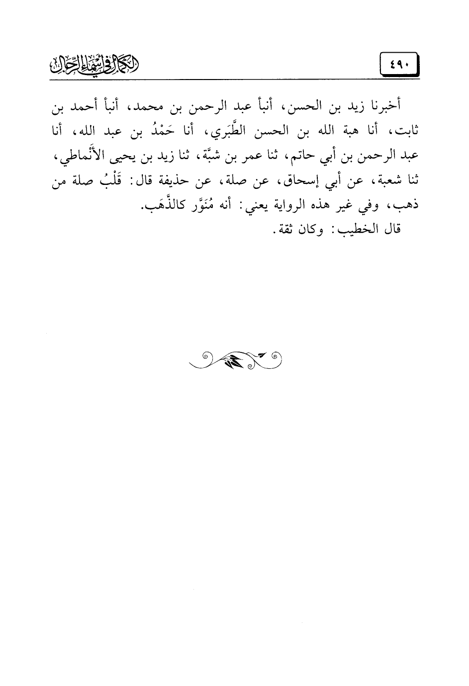 أخبرنا زيد بن الحسن، أنبأ عبد الرحمن بن محمد، أنبأ أحمد بن ثابت، أنا هبة الله بن الحسن الطَّبَري، أنا حَمْدُ بن عبد الله، أنا عبد الرحمن بن أبي حاتم، ثنا عمر بن شبَّة، ثنا زيد بن يحيى الأَنْماطي، ثنا شعبة، عن أبي إسحاق، عن صلة، عن حذيفة قال: قَلْبُ صلة من ذهب، وفي غير هذه الرواية يعني: أنه مُنَوَّر كالذَّهَب.