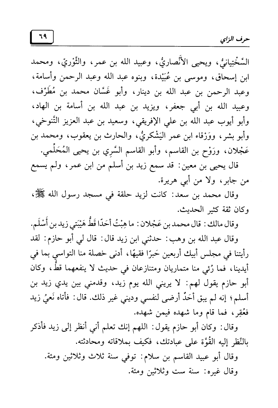 وقال محمد بن سعد: كانت لزيد حلقة في مسجد رسول الله -صَلَّى اللهُ عَلَيْهِ وَسَلَّمَ-، وكان ثقة كثير الحديث.