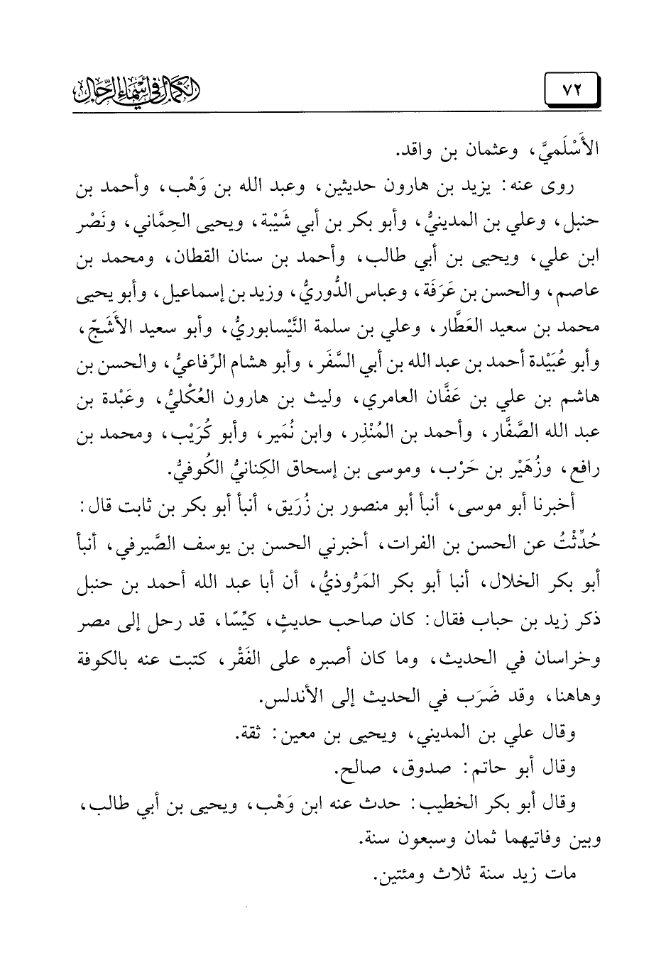 أخبرنا أبو موسى، أنبأ أبو منصور بن زُرَيق، أنبأ أبو بكر بن ثابت قال: حُدِّثْتُ عن الحسن بن الفرات، أخبرني الحسن بن يوسف الصَّيرفي، أنبأ أبو بكر الخلال، أنبا أبو بكر المَرُّوذيُّ، أن أبا عبد الله أحمد بن حنبل ذكر زيد بن حباب فقال: كان صاحب حديثٍ، كيِّسًا، قد رحل إلى مصر وخراسان في الحديث، وما كان أصبره على الفَقْر، كتبت عنه بالكوفة وهاهنا، وقد ضَرَب في الحديث إلى الأندلس.