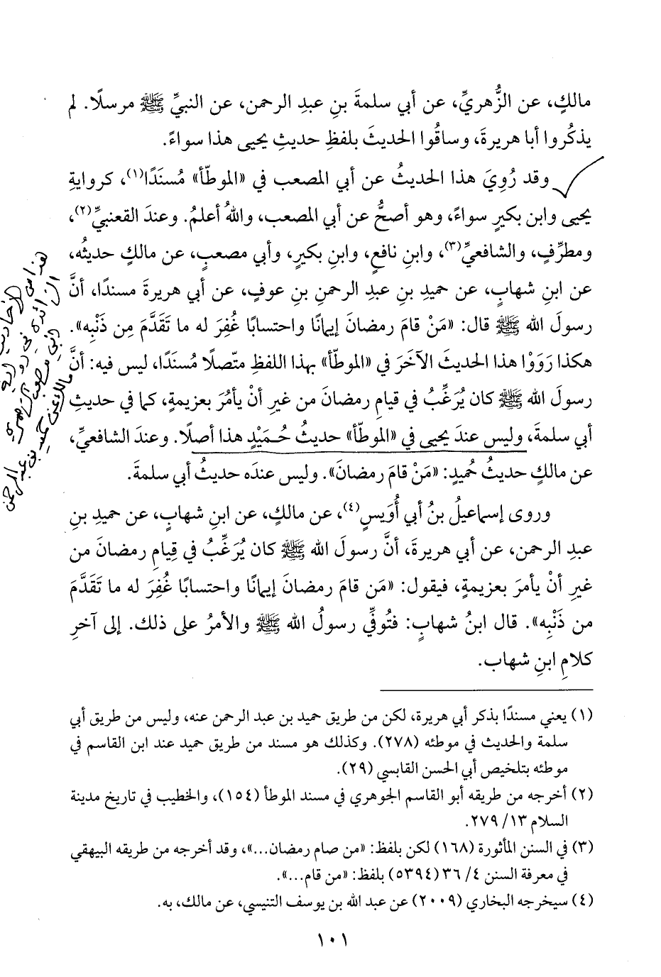 (¬١) يعني مسندًا بذكر أبي هريرة، لكن من طريق حميد بن عبد الرحمن عنه، وليس من طريق أبي سلمة والحديث في موطئه (٢٧٨). وكذلك هو مسند من طريق حميد عند ابن القاسم في موطئه بتلخيص أبي الحسن القابسي (٢٩).