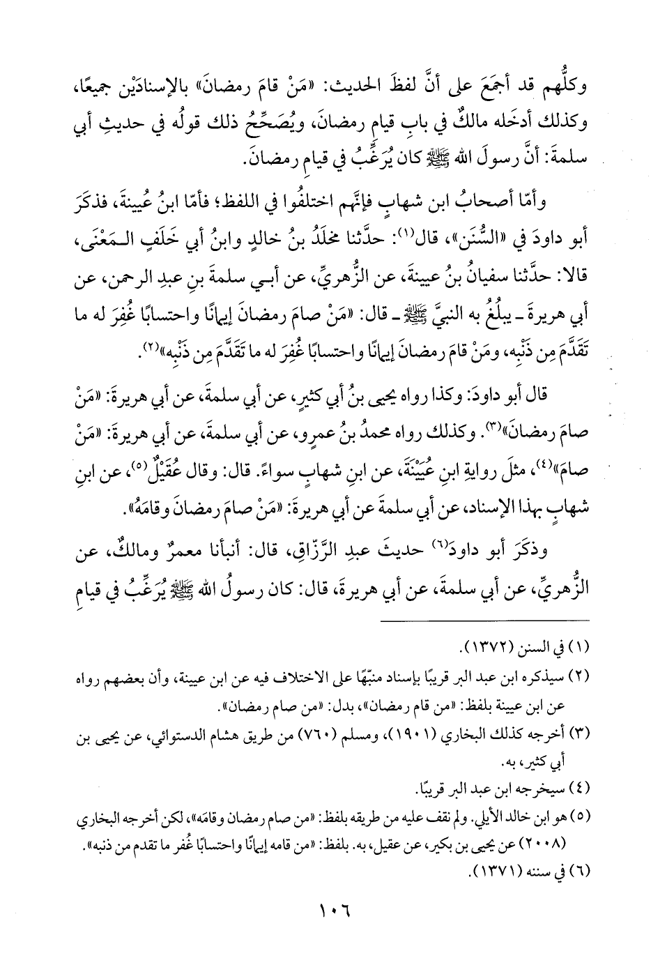 وكلُّهم قد أجمَعَ على أنَّ لفظَ الحديث: "مَنْ قامَ رمضانَ" بالإسنادَيْن جميعًا، وكذلك أدخَله مالكٌ في بابِ قيامٍ رمضانَ، ويُصحِّحُ ذلك قولُه في حديثِ أبي سلمةَ: أنَّ رسولَ الله - صلى الله عليه وسلم - كان يُرَغِّبُ في قيامِ رمضانَ.