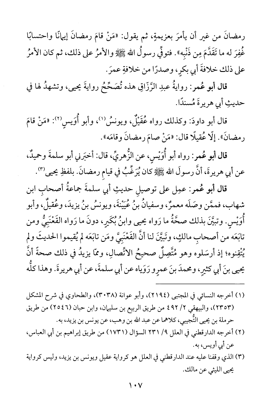 قال أبو عُمر: عمِل على توصيلِ حديثِ أبي سلمةَ جماعةُ أصحابِ ابن شهاب، فممَّن وصَلَه معمرٌ، وسفيانُ بنُ عُيَيْنةَ، ويونسُ بنُ يزيدَ، وعُقيلٌ، وأبو أُوَيْسٍ. وتبيَّنَ بذلك صحَّةُ ما رَواه يحيى وابنُ بُكَيرٍ، دونَ ما رَواه القَعْنَبِيُّ ومن تابَعَه من أصحابِ مالكٍ، وتَبيَّنَ لنا أنَّ القَعْنَبِيَّ ومَن تابَعَه لم يُقيموا الحديثَ ولم يُتْقِنوه؛ إذ أرسَلوه وهو مُتَّصِلٌ صحيحُ الاتِّصالِ، وممّا يزيدُ في ذلك صحةً أنَّ يحيى بنَ أبي كثيرٍ، ومحمدَ بنَ عمرٍو رَوَياه عن أبي سلمةَ، عن أبي هريرةَ. وهذا كلُّه