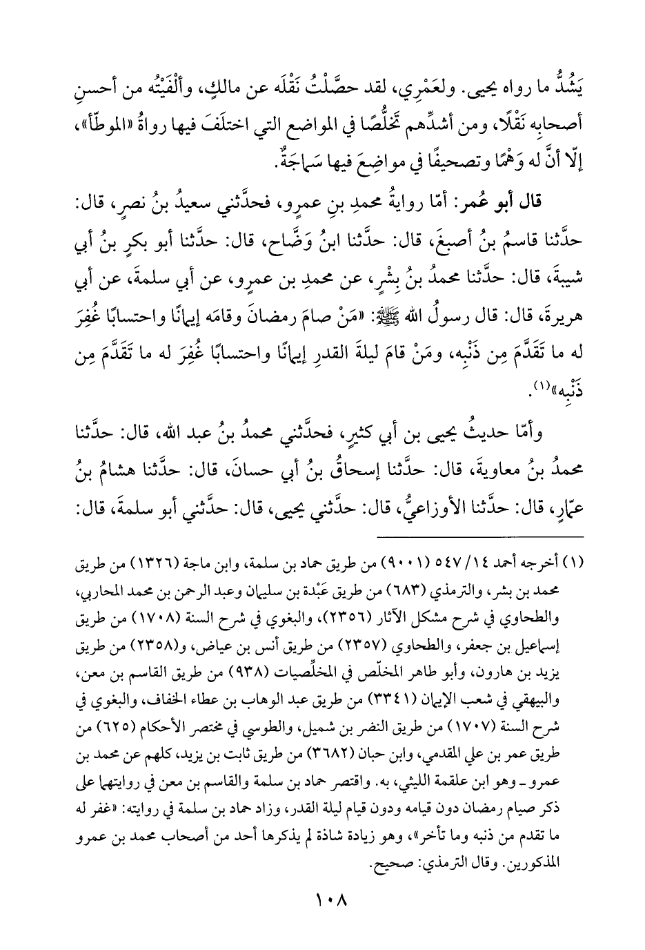 قال أبو عُمر: أمّا روايةُ محمدِ بنِ عمرٍو، فحدَّثني سعيدُ بنُ نصرٍ، قال: حدَّثنا قاسمُ بنُ أصبغَ، قال: حدَّثنا ابنُ وَضَّاح، قال: حدَّثنا أبو بكرٍ بنُ أبي شيبةَ، قال: حدَّثنا محمدُ بنُ بِشْرٍ، عن محمدِ بن عمرٍو، عن أبي سلمةَ، عن أبي هريرةَ، قال: قال رسولُ الله - صلى الله عليه وسلم -: "مَنْ صامَ رمضانَ وقامَه إيمانًا واحتسابًا غُفِرَ له ما تَقَدَّمَ مِن ذَنْبِه، ومَنْ قامَ ليلةَ القدرِ إيمانًا واحتسابًا غُفِرَ له ما تَقَدَّمَ مِن ذَنْبِه" (¬١).
