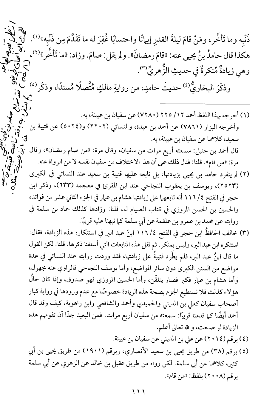 (¬٣) خالف الحافظ ابن حجر في الفتح ٤/ ١١٦ ابنَ عبد البر في استنكاره هذه الزيادة، فقال: استنكره ابن عبد البر، وليس بمنكر. ثم نقل هذه المتابعات التي أسلفنا ذكرها. قلنا: لكن القول ما قال ابنُ عبد البر، فلم يطَّرد قتيبة على زيادتها، فقد وردت روايته عند النسائي في عدة مواضع من السنن الكبرى دون سائر المواضع، وأما يوسف النجاحي فالراوي عنه مجهول، وأما هشام بن عمار فكبر فصار يتلقّن، وأما الحسين المروزي فهو صدوق، وإذا كان حالُ هؤلاء كذلك فلا نستطيع الجزم بصحة هذه الزيادة خصوصًا مع عدم ورودها في رواية كبار أصحاب سفيان كعلي بن المديني والحميدي وأحمد والشافعي وابن راهوية، كيف وقد قال أحمد أيضًا كما قدمنا قريبًا: سمعته من سفيان أربع مرات. فمن البعيد جدًّا أن تفوتهم هذه الزيادة لو صحت، والله تعالى أعلم.