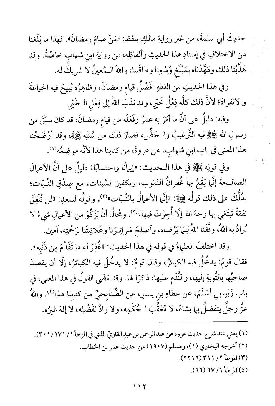 (¬١) يعني عند شرح حديث عروة عن عبد الرحمن بن عبدٍ القاريّ الذي في الموطأ ١/ ١٧١ (٣٠١).