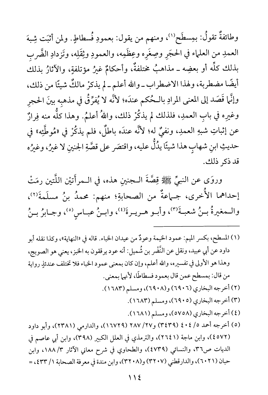 وطائفةٌ تقولُ: بمِسطَح (¬١)، ومنهم من يقول: بعمودِ فُسطاطٍ. ولمن أثبَت شِبهَ العمدِ من العلماء في الحجَرِ وصِغَرِه وعِظَمِه، والعمودِ وثقَلِه، وتَزدادِ الضَّربِ بذلك كلِّه أو بعضِه - مذاهبُ مختلفة، وأحكامٌ غيرُ مؤتلفةٍ، والآثارُ بذلك أيضًا مضطربة، ولهذا الاضطراب - والله أعلم - لم يذكرْ مالكٌ شيئًا من ذلك، وإنَّما قَصَد إلى المعنى المرادِ بالحُكم عندَه؛ لأنَّه لا يُفرِّقُ في مذهبِه بينَ الحجرِ وغيرِه في بابِ العمدِ، فلذلك لم يذكُرْ ذلك، واللهُ أعلمُ. وهذا كلُّه منه فِرارٌ عن إثباتِ شبهِ العمدِ، ونفيٌ له؛ لأنّه عندَه باطلٌ، فلم يذكُرْ في "مُوطَّئِه" في حديثِ ابنِ شهابٍ هذا شيئًا يدُلُّ عليه، واقتصَر على قصَّةِ الجنينِ لا غيرُ، وغيرُه قد ذكر ذلك.