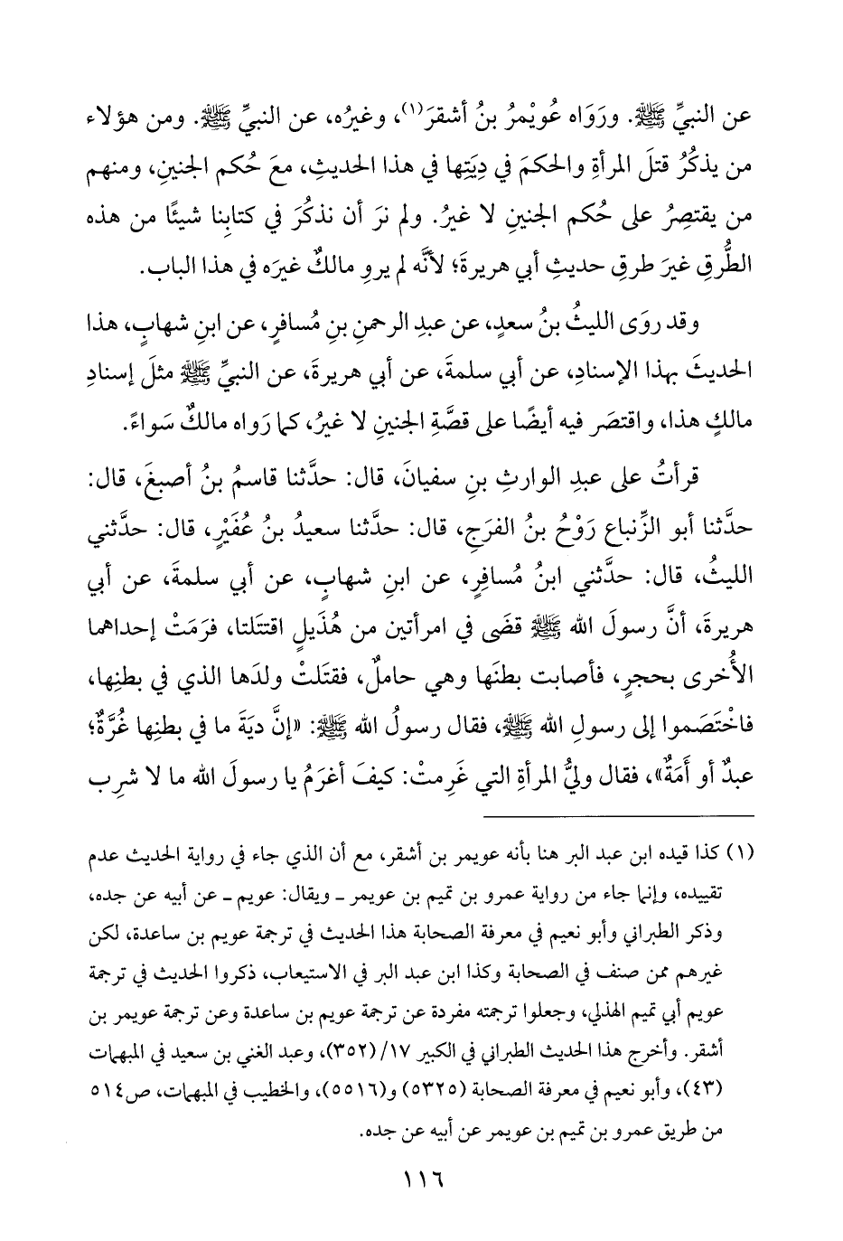 عن النبيِّ - صلى الله عليه وسلم -. ورَوَاه عُويْمرُ بنُ أشقرَ (¬١)، وغيرُه، عن النبيِّ - صلى الله عليه وسلم -. ومن هؤلاء من يذكُرُ قتلَ المرأةِ والحكمَ في دِيَتِها في هذا الحديثِ، معَ حُكم الجنينِ، ومنهم من يقتصِرُ على حُكم الجنينِ لا غيرُ. ولم نرَ أن نذكُرَ في كتابِنا شيئًا من هذه الطُّرقِ غيرَ طرقِ حديثِ أبي هريرةَ؛ لأنَّه لم يروِ مالكٌ غيرَه في هذا الباب.