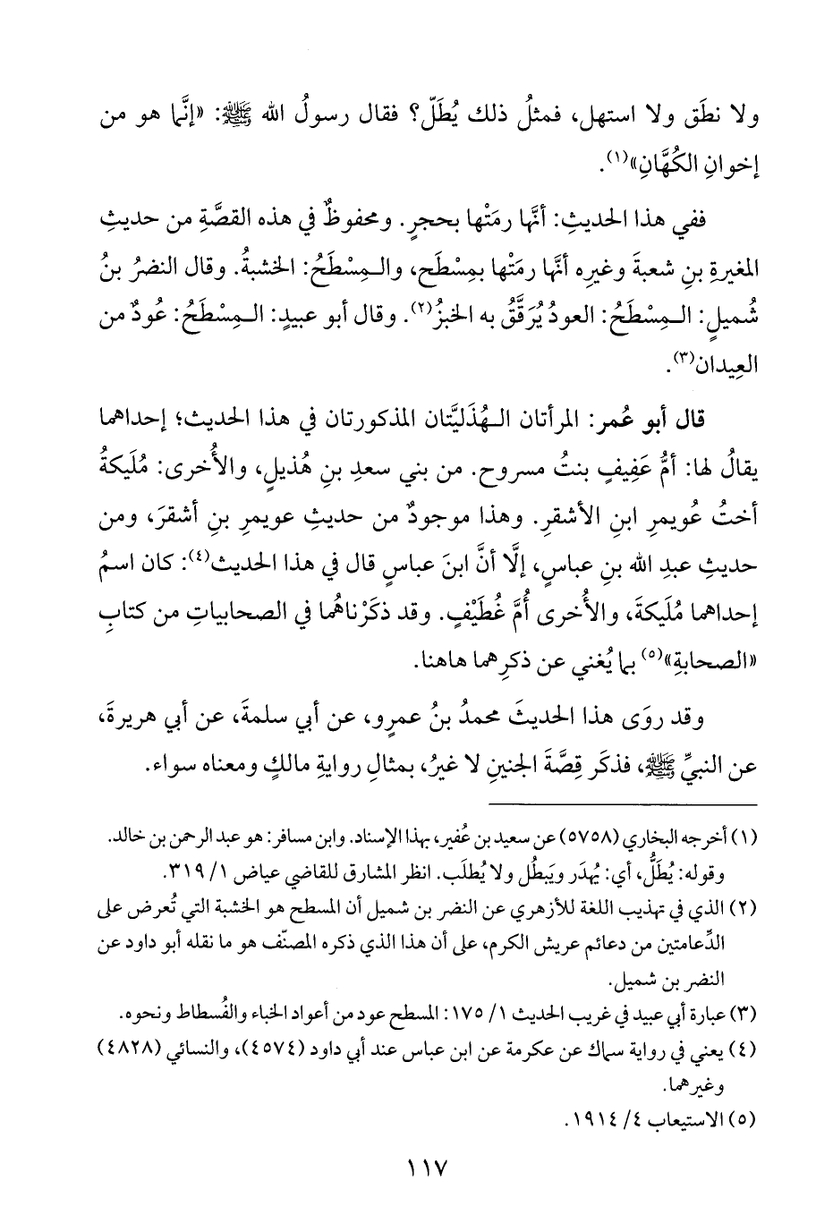 ففي هذا الحديثِ: أنَّها رمَتْها بحجرٍ. ومحفوظٌ في هذه القصةِ من حديثِ المغيرةِ بنِ شعبةَ وغيرِه أنَّها رمَتْها بمِسْطَح، والمِسْطَحُ: الخشبةُ. وقال النضرُ بنُ شُميلٍ: المِسْطَحُ: العودُ يُرَقَّقُ به الخبزُ (¬٢). وقال أبو عبيدٍ: المِسْطَحُ: عُودٌ من العِيدان (¬٣).