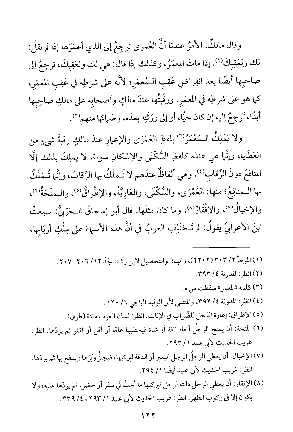 ولا يَمْلِكُ المُعْمَرُ (¬٣) بلفظِ العُمْرَى والإعمارِ عندَ مالكٍ رقبةَ شيءٍ من العَطَايا، وإنَّما هي عندَه كلفظِ السُّكْنَى والإسْكانِ سواءً، لا يملِكُ بذلك إلَّا المنافعَ دونَ الرِّقابِ (¬٤)، وهي ألفاظٌ عندَهم لا تُملَكُ بها الرِّقابُ، وإنَّما تُمْلَكُ بها المنافِعُ؛ منها: العُمْرَى، والسُّكْنَى، والعَارِيَّةُ، والإطْراقُ (¬٥)، والمنْحَةُ (¬٦)، والإخبالُ (¬٧)، والإفْقَارُ (¬٨)، وما كان مثلَها. قال أبو إسحاقَ الحَرْبيُّ: سِحتُ ابنَ الأعرابيِّ يقولُ: لم تَختَلِفِ العربُ في أنَّ هذه الأسماءَ على مِلْكِ أربَابِها،