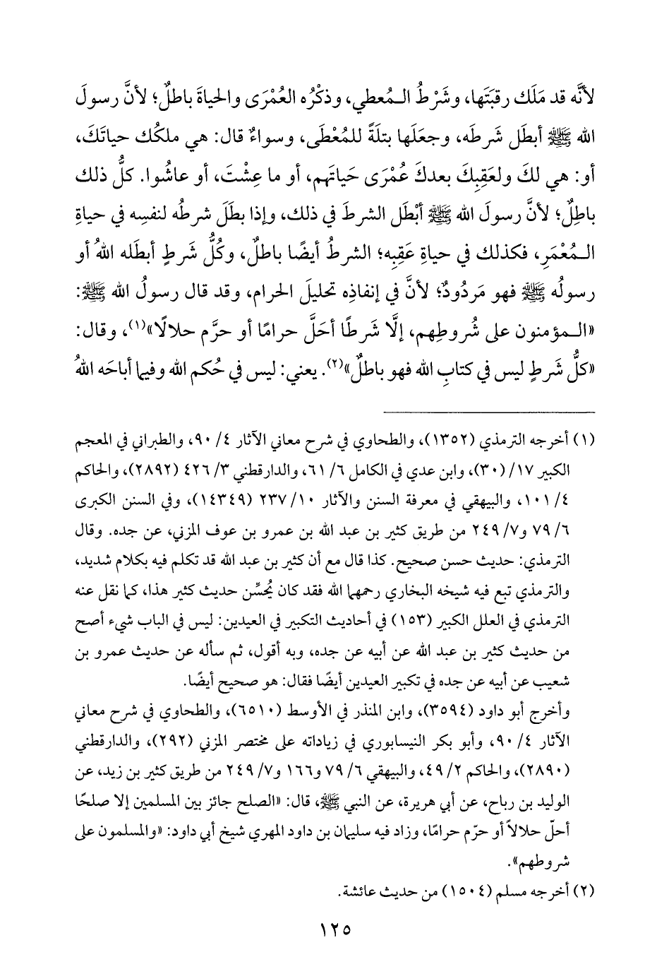وأخرج أبو داود (٣٥٩٤)، وابن المنذر في الأوسط (٦٥١٠)، والطحاوي في شرح معاني الآثار ٤/ ٩٠، وأبو بكر النيسابوري في زياداته على مختصر المزني (٢٩٢)، والدارقطني (٢٨٩٠)، والحاكم ٢/ ٤٩، والبيهقي ٦/ ٧٩ و ١٦٦ و ٧/ ٢٤٩ من طريق كثير بن زيد، عن الوليد بن رباح، عن أبي هريرة، عن النبي - صلى الله عليه وسلم -، قال: "الصلح جائز بين المسلمين إلا صلحًا أحلّ حلالًا أو حرّم حرامًا، وزاد فيه سليمان بن داود المهري شيخ أبي داود: "والمسلمون على شروطهم".