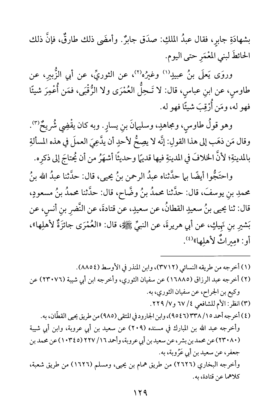 بشهادَةِ جابرٍ، فقال عبدُ الملكِ: صدَق جابرٌ. وأمضَى ذلك طارقٌ، فإنَّ ذلك الحائطَ لبني المعْمَرِ حتى اليوم.