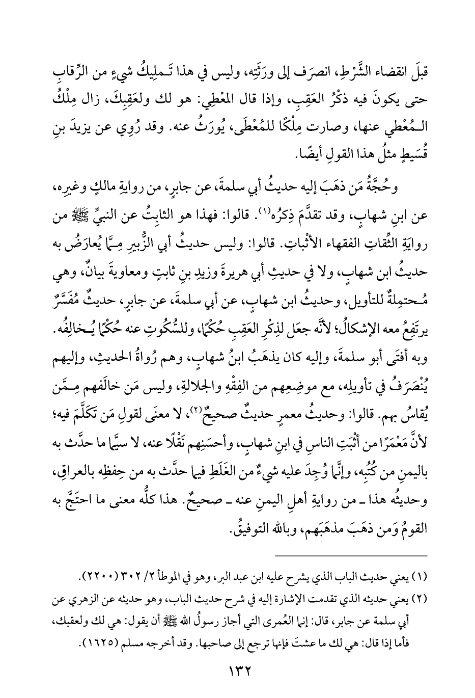 وحُجَّةُ مَن ذهَبَ إليه حديثُ أبي سلمةَ، عن جابرٍ، من روايةِ مالكٍ وغيرِه، عن ابنِ شهابٍ، وقد تقدَّمَ ذِكرُه (¬١). قالوا: فهذا هو الثابِتُ عن النبيِّ - صلى الله عليه وسلم - من روايَةِ الثِّقاتِ الفقهاء الأثْباتِ. قالوا: وليس حديثُ أبي الزُّبيرِ مِمَّا يُعارَضُ به حديثُ ابن شهابٍ، ولا في حديثِ أبي هريرةَ وزيدِ بنِ ثابتٍ ومعاويةَ بيانٌ، وهي مُحتمِلةٌ للتأويل، وحديثُ ابن شهابٍ، عن أبي سلمةَ، عن جابرٍ، حديثٌ مُفَسَّرٌ يرتَفِعُ معه الإشكالُ؛ لأنَّه جعَل لذِكْرِ العَقِبِ حُكْمًا، وللسُّكُوتِ عنه حُكْمًا يُخالِفُه. وبه أفتَى أبو سلمةَ، وإليه كان يذهَبُ ابنُ شهابٍ، وهم رُواةُ الحديثِ، وإليهم يُنْصَرَفُ في تأويلِه، مع موضِعِهم من الفِقْهِ والجلالةِ، وليس مَن خالَفهم مِمَّن يُقاسُ بهم. قالوا: وحديثُ معمرٍ حديثٌ صحيحٌ (¬٢)، لا معنَى لقولِ مَن تَكَلَّمَ فيه؛ لأنَّ مَعْمَرًا من أثْبَتِ الناسِ في ابنِ شهابٍ، وأحسَنِهم نَقْلًا عنه، لا سيَّما ما حدَّث به باليمنِ من كُتُبِه، وإنَّما وُجِدَ عليه شيءٌ من الغَلَطِ فيما حدَّث به من حِفظِه بالعراقِ، وحديثُه هذا - من روايةِ أهلِ اليمنِ عنه - صحيحٌ. هذا كلُّه معنى ما احتَجَّ به القومُ وَمن ذهَبَ مذهَبَهم، وبالله التوفيقُ.