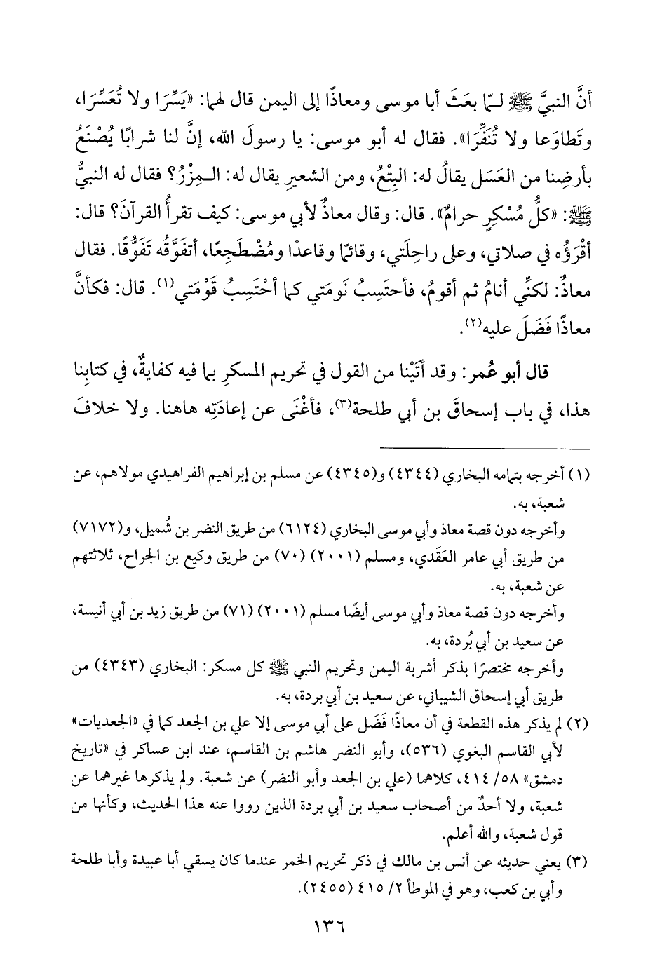 قال أبو عُمر: وقد أتَيْنا من القول في تحريم المسكرِ بما فيه كفايةٌ، في كتابِنا هذا، في باب إسحاقَ بن أبي طلحة (¬٣)، فأغْنَى عن إعادَتِه هاهنا. ولا خلافَ
