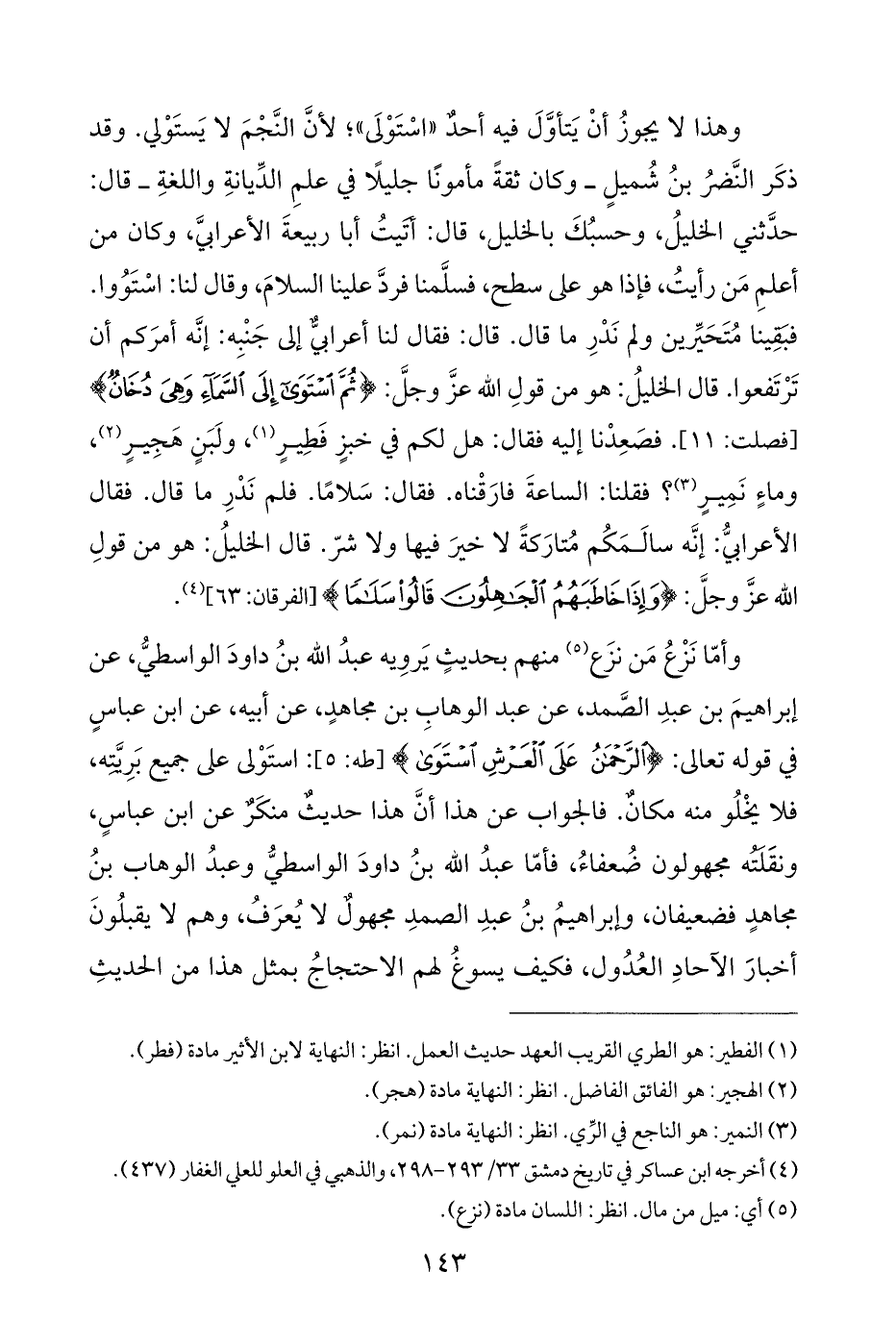 وهذا لا يجوزُ أنْ يَتأوَّلَ فيه أحدٌ "اسْتَوْلَى"؛ لأنَّ النَّجْمَ لا يَستَوْلي. وقد ذكَر النَّضرُ بنُ شُميلٍ - وكان ثقةً مأمونًا جليلًا في علمِ الدِّيانةِ واللغةِ - قال: حدَّثني الخليلُ، وحسبُكَ بالخليل، قال: أتَيتُ أبا ربيعةَ الأعرابيَّ، وكان من أعلمِ مَن رأيتُ، فإذا هو على سطح، فسلَّمنا فردَّ علينا السلامَ، وقال لنا: اسْتَوُوا. فبَقِينا مُتَحَيِّرين ولم نَدْرِ ما قال. قال: فقال لنا أعرابيٌّ إلى جَنْبِه: إنَّه أمرَكم أن تَرْتَفعوا. قال الخليلُ: هو من قولِ الله عزَّ وجلَّ: {ثُمَّ اسْتَوَى إِلَى السَّمَاءِ وَهِيَ دُخَانٌ} [فصلت: ١١]. فصَعِدْنا إليه فقال: هل لكم في خبزٍ فَطِيرٍ (¬١)، ولَبَنٍ هَجِيرٍ (¬٢)، وماءٍ نَمِيرٍ (¬٣)؟ فقلنا: الساعةَ فارَقْناه. فقال: سَلامًا. فلم نَدْرِ ما قال. فقال الأعرابيُّ: إنَّه سالَمَكُم مُتارَكةً لا خيرَ فيها ولا شرّ. قال الخليلُ: هو من قولِ الله عزَّ وجلَّ: {وَإِذَا خَاطَبَهُمُ الْجَاهِلُونَ قَالُوا سَلَامًا} [الفرقان: ٦٣] (¬٤).