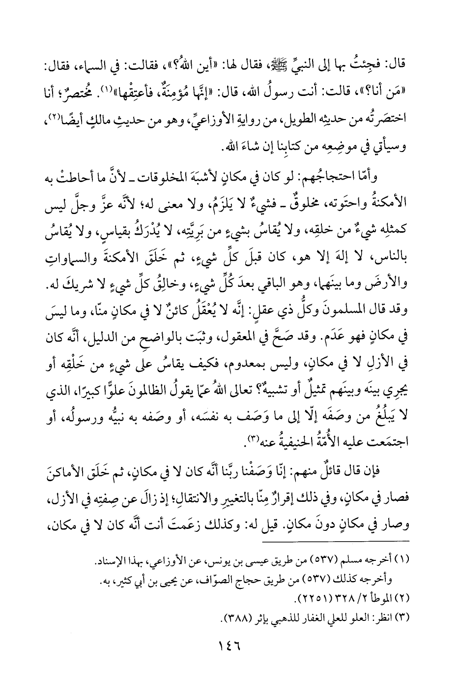 وأمّا احتجاجُهم: لو كان في مكانٍ لأشبَهَ المخلوقات - لأنَّ ما أحاطتْ به الأمكنةُ واحتَوته، مخلوقٌ - فشيءٌ لا يَلزَمُ، ولا معنى له؛ لأنَّه عزَّ وجلَّ ليس كمثلِه شيءٌ من خلقِه، ولا يُقاسُ بشيءٍ من بَرِيَّتِه، لا يُدْرَكُ بقياسٍ، ولا يُقاسُ بالناس، لا إلهَ إلا هو، كان قبلَ كلِّ شيءٍ، ثم خَلَقَ الأمكنةَ والسماواتِ والأرضَ وما بينَهما، وهو الباقي بعدَ كُلِّ شيءٍ، وخالِقُ كلِّ شيءٍ لا شريكَ له. وقد قال المسلمونَ وكلُّ ذي عقلٍ: إنَّه لا يُعْقَلُ كائنٌ لا في مكانٍ منّا، وما ليسَ في مكانٍ فهو عَدَم. وقد صَحَّ في المعقول، وثبَت بالواضحِ من الدليل، أنَّه كان في الأزلِ لا في مكانٍ، وليس بمعدوم، فكيف يقاسُ على شيءٍ من خَلْقِه أو يجرِي بينَه وبينَهم تمثيلٌ أو تشبيهٌ؟ تعالى اللهُ عمّا يقولُ الظالمونَ علوًّا كبيرًا، الذي لا يَبلُغُ من وصَفَه إلّا إلى ما وَصَف به نفسَه، أو وصفه به نبيُّه ورسولُه، أو اجتمَعت عليه الأُمّةُ الحنيفيةُ عنه (¬٣).