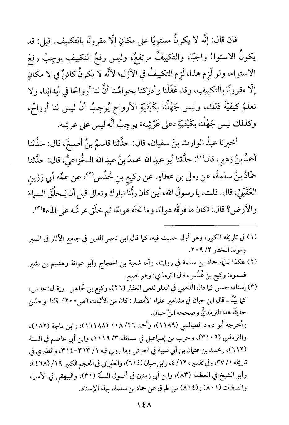 فإن قال: إنَّه لا يكونُ مستويًا على مكانٍ إلّا مقرونًا بالتكييف. قيل: قد يكونُ الاستواءُ واجبًا، والتكييفُ مرتفعٌ، وليس رفعُ التكييفِ يوجِبُ رفعَ الاستواء، ولو لَزِم هذا، لَزِم التكييفُ في الأزل؛ لأنَّه لا يكونُ كائنٌ في لا مكانٍ إلّا مقرونًا بالتكييفِ، وقد عَقَلْنا وأدرَكنا بحواسِّنا أنَّ لنا أرواحًا في أبدانِنا، ولا نعلمُ كيفيّةَ ذلك، وليس جَهْلُنا بكَيْفيّةِ الأرواح يُوجِبُ أنْ ليس لنا أرواحٌ، وكذلك ليس جَهْلُنا بكَيْفيّةِ "على عَرْشِه" يوجِبُ أنَّه ليس على عرشِه.