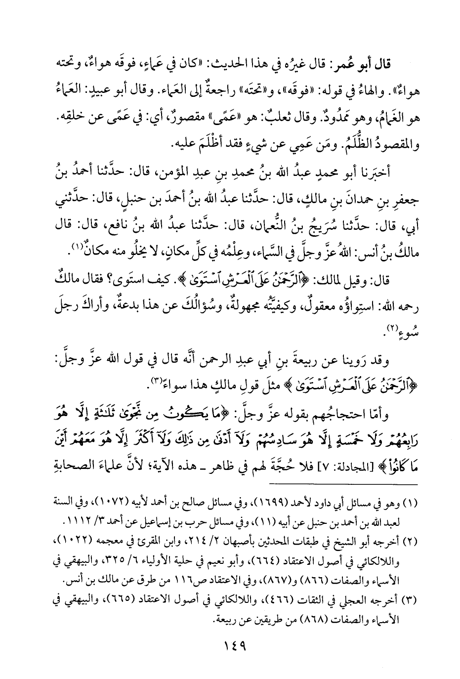 (¬٢) أخرجه أبو الشيخ في طبقات المحدثين بأصبهان ٢/ ٢١٤، وابن المقرئ في معجمه (١٠٢٢)، واللالكائي في أصول الاعتقاد (٦٦٤)، وأبو نعيم في حلية الأولياء ٦/ ٣٢٥، والبيهقي في الأسماء والصفات (٨٦٦) و (٨٦٧)، وفي الاعتقاد ص ١١٦ من طرق عن مالك بن أنس.