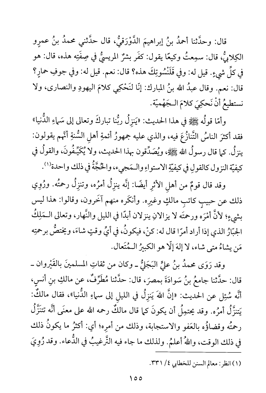 قال: وحدَّثنا أحمدُ بنُ إبراهيمَ الدَّوْرَقيُّ، قال حدَّثني محمدُ بنُ عمرٍو الكِلابيُّ، قال: سمِعتُ وكيعًا يقول: كفَر بشرٌ المريسيُّ في صِفَتِه هذه، قال: هو في كلِّ شيءٍ. قيل له: وفي قَلَنْسُوتِكَ هذه؟ قال: نعم. قيل له: وفي جوفِ حمارٍ؟ قال: نعم. وقال عبدُ الله بنُ المبارك: إنّا لنَحْكِي كلامَ اليهودِ والنصارى، ولا نستطيعُ أنْ نَحكِيَ كلامَ الجَهْميّة.