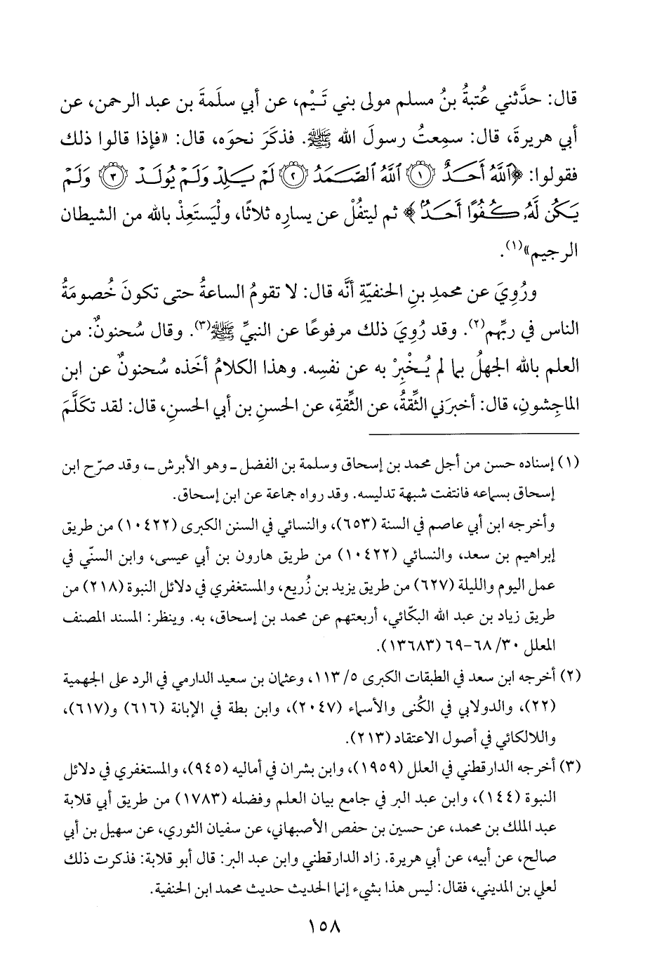 (¬٣) أخرجه الدارقطني في العلل (١٩٥٩)، وابن بشران في أماليه (٩٤٥)، والمستغفري في دلائل النبوة (١٤٤)، وابن عبد البر في جامع بيان العلم وفضله (١٧٨٣) من طريق أبي قلابة عبد الملك بن محمد، عن حسين بن حفص الأصبهاني، عن سفيان الثوري، عن سهيل بن أبي صالح، عن أبيه، عن أبي هريرة. زاد الدارقطني وابن عبد البر: قال أبو قلابة: فذكرت ذلك لعلي بن المديني، فقال: ليس هذا بشيء إنما الحديث حديث محمد ابن الحنفية.