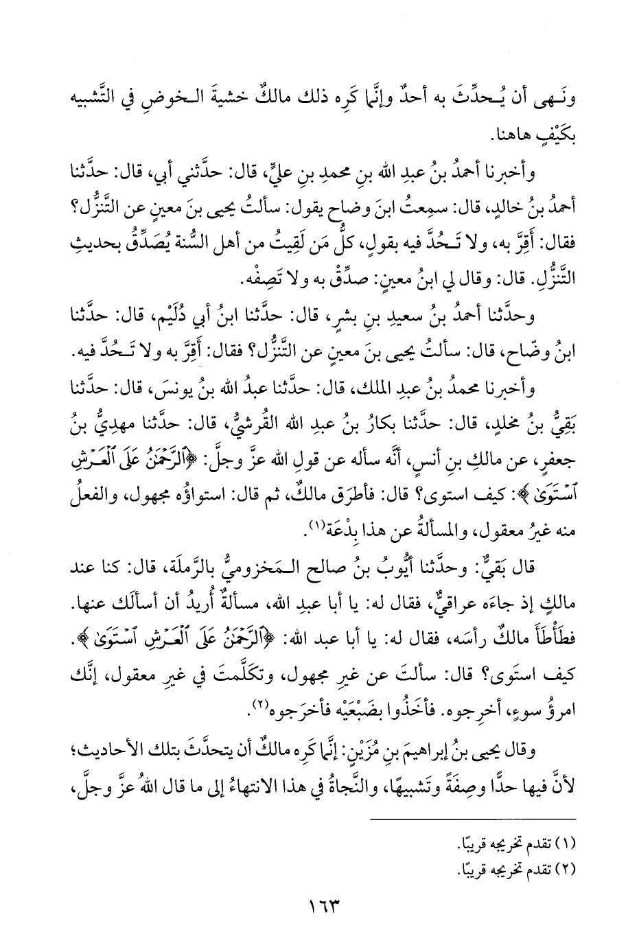 وقال يحيى بنُ إبراهيمَ بنِ مُزَيْنٍ: إنَّما كَرِه مالكٌ أن يتحدَّثَ بتلك الأحاديث، لأنَّ فيها حدًّا وصِفَةً وتَشبيهًا، والنَّجاةُ في هذا الانتهاءُ إلى ما قال اللهُ عزَّ وجلَّ،