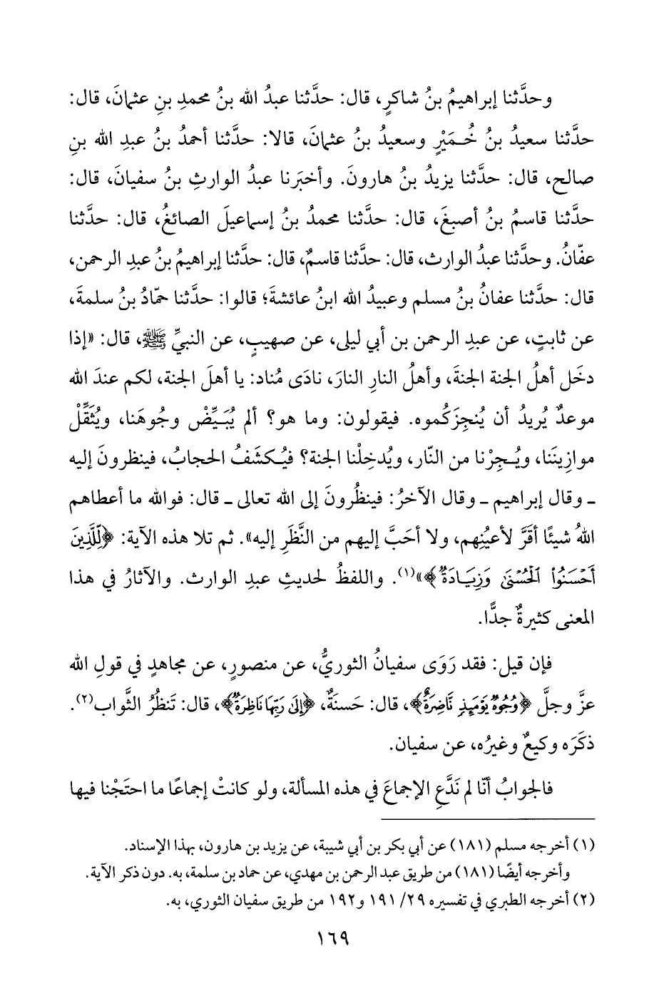 وحدَّثنا إبراهيمُ بنُ شاكرٍ، قال: حدَّثنا عبدُ الله بنُ محمدِ بنِ عثمانَ، قال: حدَّثنا سعيدُ بنُ خُمَيْرٍ وسعيدُ بنُ عثمانَ، قالا: حدَّثنا أحمدُ بنُ عبدِ الله بنِ صالح، قال: حدَّثنا يزيدُ بنُ هارونَ. وأخبَرنا عبدُ الوارثِ بنُ سفيانَ، قال: حدَّثنا قاسمُ بنُ أصبغَ، قال: حدَّثنا محمدُ بنُ إسماعيلَ الصائغُ، قال: حدَّثنا عفّانُ. وحدَّثنا عبدُ الوارث، قال: حدَّثنا قاسمٌ، قال: حدَّثنا إبراهيمُ بنُ عبدِ الرحمن، قال: حدَّثنا عفانُ بنُ مسلم وعبيدُ الله ابنُ عائشةَ؛ قالوا: حدَّثنا حمّادُ بنُ سلمةَ، عن ثابتٍ، عن عبدِ الرحمن بن أبي ليلى، عن صهيبٍ، عن النبيِّ - صلي الله عليه وسلم -، قال: "إذا دخَل أهلُ الجنة الجنةَ، وأهلُ النارِ النارَ، نادَى مُناد: يا أهلَ الجنة، لكم عندَ الله موعدٌ يُريدُ أن يُنجِزَكُموه. فيقولون: وما هو؟ ألم يُبَيِّضْ وجُوهَنا، ويُثَقِّلْ موازِينَنا، ويُجِرْنا من النّار، ويُدخِلْنا الجنة؟ فيُكشَفُ الحجابُ، فينظرونَ إليه - وقال إبراهيم - وقال الآخرُ: فينظُرونَ إلى الله تعالى - قال: فوالله ما أعطاهم اللهُ شيئًا أقَرَّ لأعيُنِهم، ولا أحَبَّ إليهم من النَّظَرِ إليه". ثم تلا هذه الآية: {لِلَّذِينَ أَحْسَنُوا الْحُسْنَى وَزِيَادَةٌ} " (¬١). واللفظُ لحديثِ عبدِ الوارث. والآثارُ في هذا المعنى كثيرةٌ جدًّا.