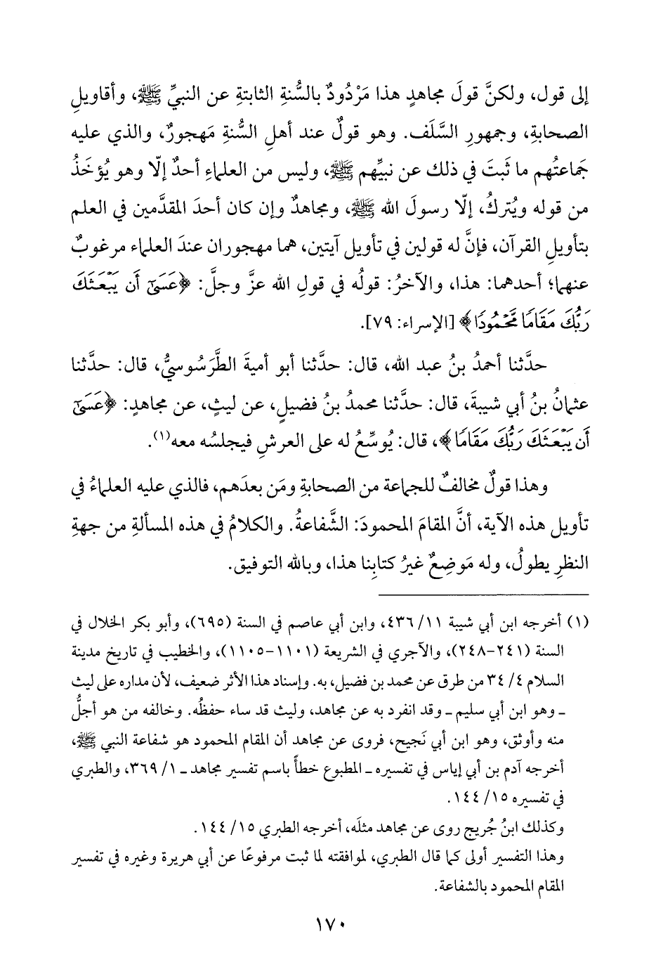 (¬١) أخرجه ابن أبي شيبة ١١/ ٤٣٦، وابن أبي عاصم في السنة (٦٩٥)، وأبو بكر الخلال في السنة (٢٤١ - ٢٤٨)، والآجري في الشريعة (١١٠١ - ١١٠٥)، والخطيب في تاريخ مدينة السلام ٤/ ٣٤ من طرق عن محمد بن فضيل، به. وإسناد هذا الأثر ضعيف، لأن مداره على ليث - وهو ابن أبي سليم - وقد انفرد به عن مجاهد، وليث قد ساء حفظُه. وخالفه من هو أجلُّ منه وأوثق، وهو ابن أبي نَجيح، فروى عن مجاهد أن المقام المحمود هو شفاعة النبي - صلى الله عليه وسلم -، أخرجه آدم بن أبي إياس في تفسيره - المطبوع خطأً باسم تفسير مجاهد - ١/ ٣٦٩، والطبري في تفسيره ١٥/ ١٤٤.