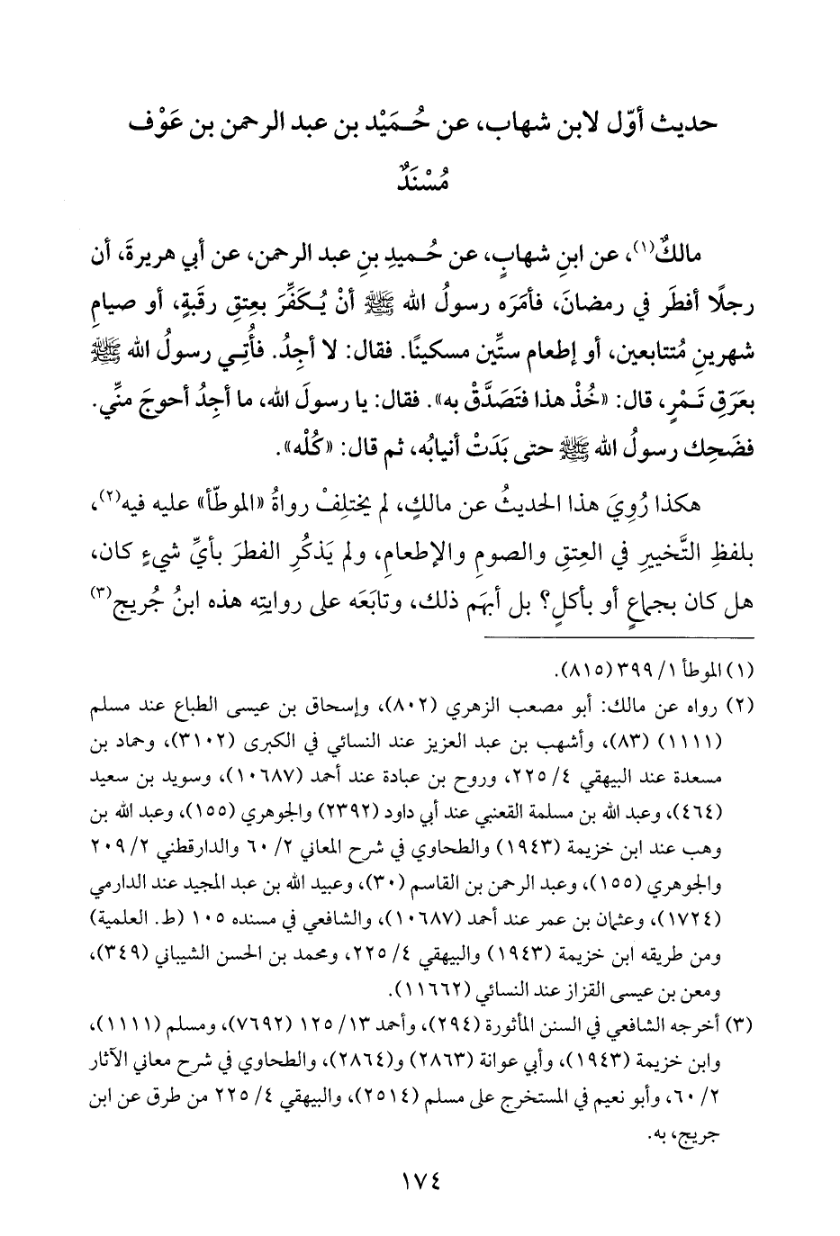(¬٢) رواه عن مالك: أبو مصعب الزهري (٨٠٢)، وإسحاق بن عيسى الطباع عند مسلم (١١١١) (٨٣)، وأشهب بن عبد العزيز عند النسائي في الكبرى (٣١٠٢)، وحماد بن مسعدة عند البيهقي ٤/ ٢٢٥، وروح بن عبادة عند أحمد (١٠٦٨٧)، وسويد بن سعيد (٤٦٤)، وعبد الله بن مسلمة القعنبي عند أبي داود (٢٣٩٢) والجوهري (١٥٥)، وعبد الله بن وهب عند ابن خزيمة (١٩٤٣) والطحاوي في شرح المعاني ٢/ ٦٠ والدارقطني ٢/ ٢٠٩ والجوهري (١٥٥)، وعبد الرحمن بن القاسم (٣٠)، وعبيد الله بن عبد المجيد عند الدارمي (١٧٢٤)، وعثمان بن عمر عند أحمد (١٠٦٨٧)، والشافعي في مسنده ١٠٥ (ط. العلمية) ومن طريقه ابن خزيمة (١٩٤٣) والبيهقي ٤/ ٢٢٥، ومحمد بن الحسن الشيباني (٣٤٩)، ومعن بن عيسى القزاز عند النسائي (١١٦٦٢).