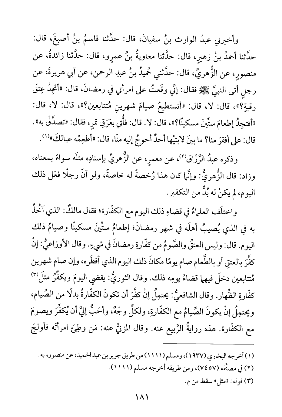 وأخبرني عبدُ الوارث بنُ سفيانَ، قال: حدَّثنا قاسمُ بنُ أصبغَ، قال: حدَّثنا أحمدُ بنُ زهيرٍ، قال: حدَّثنا معاويةُ بنُ عمرٍو، قال: حدَّثنا زائدةُ، عن منصورٍ، عن الزُّهريِّ، قال: حدَّثني حُميدُ بنُ عبدِ الرحمن، عن أبي هريرةَ، عن رجلٍ أتى النبيَّ - صلى الله عليه وسلم - فقال: إنِّي وقَعتُ على امرأتي في رمضانَ، قال: "أتجِدُ عِتقَ رقبةٍ؟ "، قال: لا، قال: "أتستطيعُ صيامَ شهرينِ مُتتابعين؟ "، قال: لا، قال: "أفتجِدُ إطعامَ ستِّينَ مسكينًا؟ "، قال: لا. قال: فأُتي بعَرَقِ تمرٍ، فقال: "تصدَّقْ به". قال: على أفقرَ منا؟ ما بينَ لابتيْها أحدٌ أحوجُ إليه منّا، قال: "أطعِمْه عيالكَ" (¬١).