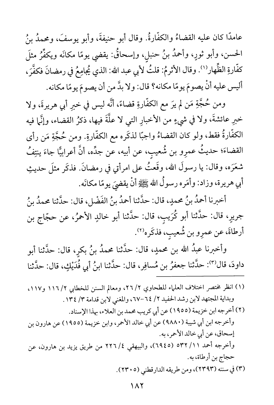 ومن حُجَّةِ مَن لم يرَ مع الكفّارةِ قضاءً، أنَّه ليس في خبرِ أبي هريرةَ، ولا خبرِ عائشةَ، ولا في شيءٍ من الأخبارِ التي لا علَّةَ فيها، ذكرُ القضاء، وإنَّما فيه الكفّارةُ فقط، ولو كان القضاءُ واجبًا لذكَره مع الكفّارةِ. ومن حُجَّةِ مَن رأى القضاءَ؛ حديثُ عمرِو بن شُعيبٍ، عن أبيه، عن جدِّه، أنَّ أعرابيًّا جاءَ ينتِفُ شعَرَه، وقال: يا رسولَ الله، وقَعتُ على امرأتي في رمضانَ. فذكَر مثلَ حديثِ أبي هريرة، وزاد: وأمَره رسولُ الله - صلي الله عليه وسلم - أنْ يقضيَ يومًا مكانَه.