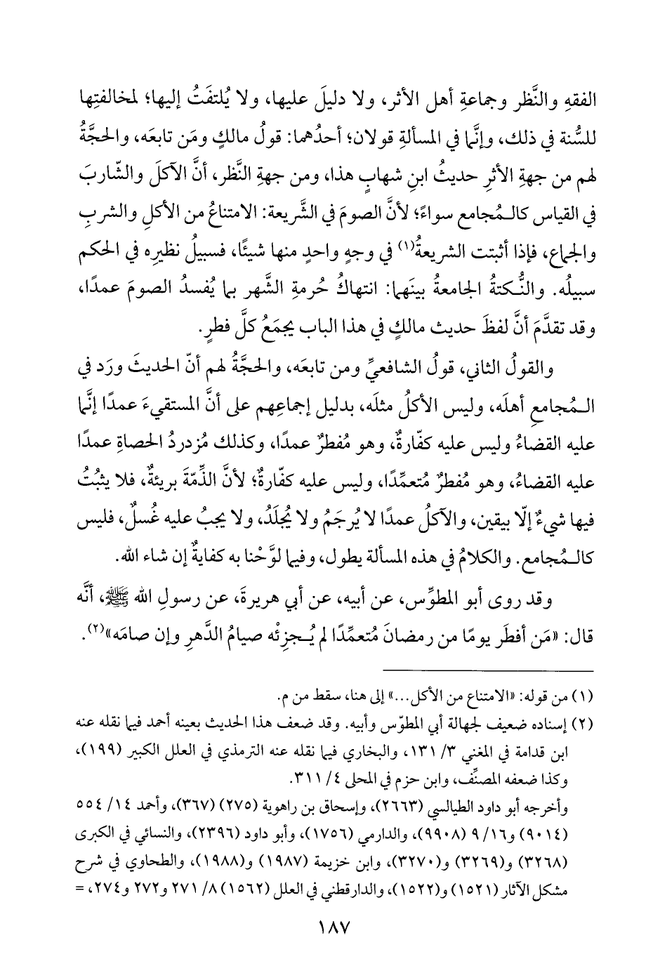 الفقهِ والنَّظر وجماعةِ أهل الأثر، ولا دليلَ عليها، ولا يُلتفَتُ إليها؛ لمخالفتِها للسُّنة في ذلك، وإنَّما في المسألةِ قولان؛ أحدُهما: قولُ مالكٍ ومَن تابعَه، والحجَّةُ لهم من جهةِ الأثرِ حديثُ ابنِ شهابٍ هذا، ومن جهةِ النَّظر، أنَّ الآكلَ والشّاربَ في القياس كالمُجامع سواءً؛ لأنَّ الصومَ في الشَّريعة: الامتناعُ من الأكلِ والشربِ والجماع، فإذا أثبتت الشريعةُ (¬١) في وجهٍ واحدٍ منها شيئًا، فسبيلُ نظيرِه في الحكم سبيلُه. والنُّكتةُ الجامعةُ بينَهما: انتهاكُ حُرمةِ الشَّهر بما يُفسدُ الصومَ عمدًا، وقد تقدَّمَ أنَّ لفظَ حديث مالكٍ في هذا الباب يجمَعُ كلَّ فطرٍ.