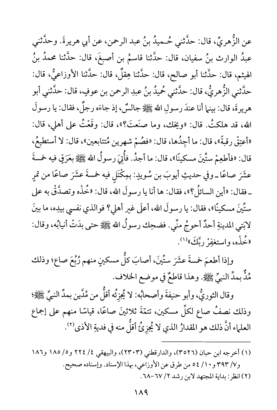 عن الزُّهريِّ، قال: حدَّثني حُميدُ بنُ عبد الرَّحمن، عن أبي هريرةَ. وحدَّثني عبدُ الوارث بنُ سفيان، قال: حَدَّثَنَا قاسمُ بن أصبغَ، قال: حَدَّثَنَا محمدُ بنُ الهيثم، قال: حَدَّثَنَا أبو صالح، قال: حَدَّثَنَا هِقلٌ، قال: حَدَّثَنَا الأوزاعيُّ، قال: حدَّثني الزُّهريُّ، قال: حدَّثني حُميدُ بنُ عبدِ الرَّحمن بن عوفٍ، قال: حدَّثني أبو هريرةَ، قال: بينما أنا عندَ رسولِ الله - صَلَّى اللهُ عَلَيْهِ وَسَلَّمَ - جالسٌ، إذ جاءَه رجلٌ، فقال: يا رسولَ الله، قد هلكتُ. قال: "ويحَك، وما صنَعتَ؟ "، قال: وقَعْتُ على أهلي، قال: "أعتِقْ رقبةً"، قال: ما أجِدُها، قال: "فصُمْ شهرين مُتتابعين"، قال: لا أستطيعُ، قال: "فأطعِمْ ستِّينَ مسكينًا"، قال: ما أجدُ. فأُتِيَ رسولُ الله - صَلَّى اللهُ عَلَيْهِ وَسَلَّمَ - بعَرَقٍ فيه خمسةَ عشَرَ صاعًا - وفي حديثِ أيوبَ بن سُويدٍ: بمِكْتَلٍ فيه خمسةَ عشَرَ صاعًا من تمرٍ - فقال: "أين السائلُ؟ "، فقال: ها أنا يا رسولَ الله، قال: "خُذْه وتصدَّقْ به على ستِّينَ مسكينًا"، فقال: يا رسولَ الله، أعلَى غير أهلي؟ فوالذي نفسي بيدِه، ما بينَ لابَتي المدينةِ أحدٌ أحوجُ منِّي. فضحِك رسولُ الله - صَلَّى اللهُ عَلَيْهِ وَسَلَّمَ - حتى بدَتْ أنيابُه، وقال: "خُذْه، واستغفِرْ ربَّكَ" (¬١).