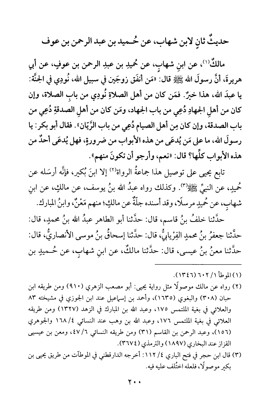 مالكٌ (¬١)، عن ابنِ شهاب، عن حُميدِ بن عبدِ الرَّحمن بن عوفٍ، عن أبي هريرةَ، أنَّ رسولَ الله - صَلَّى اللهُ عَلَيْهِ وَسَلَّمَ - قال: "مَن أنفَق زوجَين في سبيل الله، نُودِي في الجنَّة: يا عبدَ الله، هذا خيرٌ. فمَن كان من أهل الصلاةِ نُودِي من بابِ الصلاة، وإن كان من أهلِ الجهادِ دُعِي من باب الجهاد، ومَن كان من أهلِ الصدقةِ دُعِي من باب الصدقة، وإن كان مِن أهل الصيام دُعِي من باب الرَّيّان". فقال أبو بكر: يا رسولَ الله، ما على مَن يُدعَى من هذه الأبواب من ضرورةٍ، فهل يُدعَى أحدٌ من هذه الأبواب كلِّها؟ قال: "نعم، وأرجو أن تكونَ منهم".
