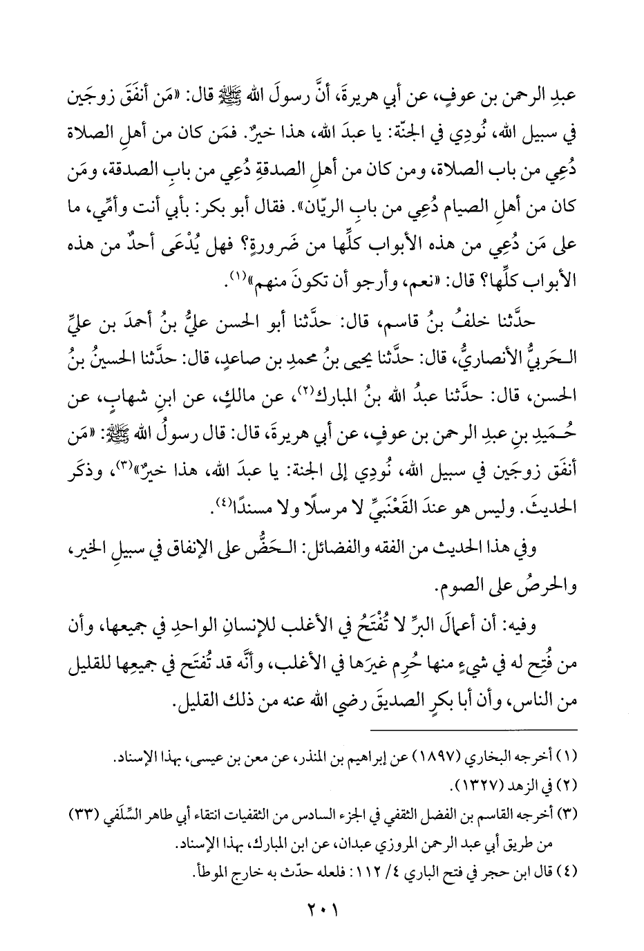 حَدَّثَنَا خلفُ بنُ قاسم، قال: حَدَّثَنَا أبو الحسن عليُّ بنُ أحمدَ بن عليِّ الحَربيُّ الأنصاريُّ، قال: حَدَّثَنَا يحيى بنُ محمدِ بن صاعدٍ، قال: حَدَّثَنَا الحسينُ بنُ الحسن، قال: حَدَّثَنَا عبدُ الله بنُ المبارك (¬٢)، عن مالكٍ، عن ابنِ شهابٍ، عن حُمَيدِ بنِ عبدِ الرَّحمن بن عوفٍ، عن أبي هريرةَ، قال: قال رسولُ الله - صَلَّى اللهُ عَلَيْهِ وَسَلَّمَ -: "مَن أنفَق زوجَين في سبيل الله، نُودِي إلى الجَنَّة: يا عبدَ الله، هذا خيرٌ" (¬٣)، وذكَر الحديثَ. وليس هو عندَ القَعْنَبيِّ لا مرسلًا ولا مسندًا (¬٤).
