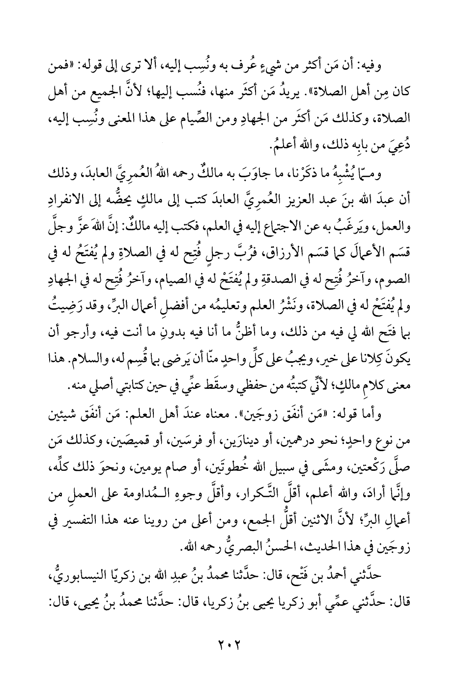 وممّا يُشْبِهُ ما ذكَرْنا، ما جاوَبَ به مالكٌ رحمه اللهُ العُمرِيَّ العابدَ، وذلك أن عبدَ الله بنَ عبد العزيز العُمرِيَّ العابدَ كتب إلى مالكٍ يحضُّه إلى الانفرادِ والعمل، وَيَرغَبُ به عن الاجتماع إليه في العلم، فكتب إليه مالكٌ: إنَّ اللهَ عزَّ وجلَّ قسَم الأعمالَ كما قسَم الأرزاق، فرُبَّ رجلٍ فُتِح له في الصلاةِ ولم يُفتَحُ له في الصوم، وآخرُ فُتِح له في الصدقةِ ولم يُفتَحْ له في الصيام، وآخرُ فُتِح له في الجهادِ ولم يُفتَحْ له في الصلاة، ونَشْرُ العلم وتعليمُه من أفضلِ أعمال البرِّ، وقد رَضِيتُ بما فتَح الله لي فيه من ذلك، وما أظنُّ ما أنا فيه بدونِ ما أنت فيه، وأرجو أن يكونَ كِلانا على خير، ويجبُ على كلِّ واحدٍ منّا أن يَرضى بما قُسِم له، والسلام. هذا معنى كلامِ مالكٍ؛ لأنِّي كتبتُه من حفظي وسقَط عنِّي في حين كتابتي أصلي منه.