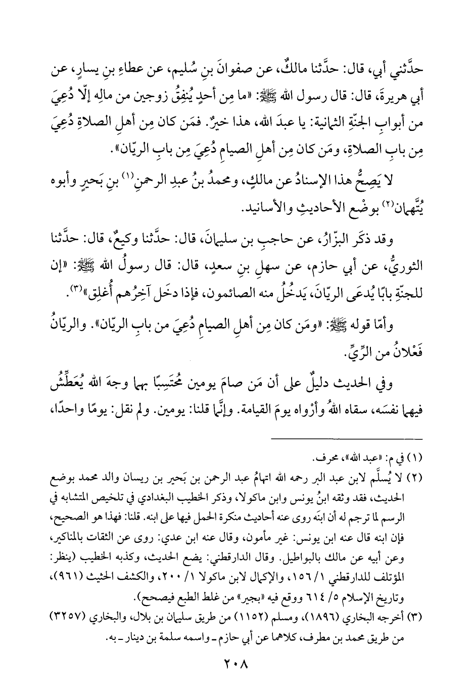 (¬٢) لا يُسلَّم لابن عبد البر رحمه الله اتهامُ عبد الرَّحمن بن بَحير بن ريسان والد محمد بوضع الحديث، فقد وثقه ابنُ يونس وابن ماكولا، وذكر الخطيب البغدادي في تلخيص التشابه في الرسم لما ترجم له أن ابنَه روى عنه أحاديث منكرة الحمل فيها على ابنه. قلنا: فهذا هو الصحيح، فإن ابنه قال عنه ابن يونس: غير مأمون، وقال عنه ابن عدي: روى عن الثقات بالمناكير، وعن أبيه عن مالك بالبواطيل. وقال الدارقطني: يضع الحديث، وكذبه الخطيب (ينظر: المؤتلف للدارقطني ١/ ١٥٦، والإكمال لابن ماكولا ١/ ٢٠٠، والكشف الحثيث (٩٦١)، وتاريخ الإسلام ٥/ ٦١٤ ووقع فيه "بجير" من غلط الطبع فيصحح).